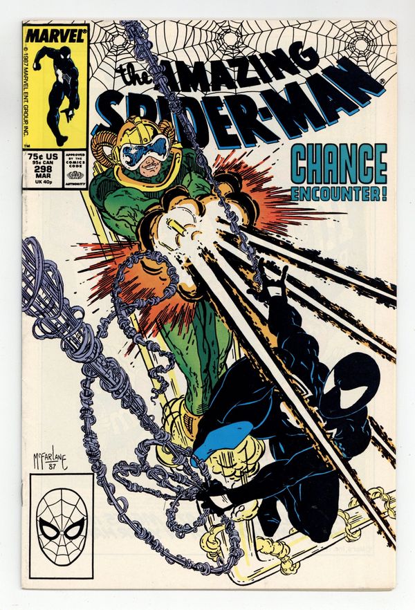Starts Mar 23 Direct Edition. "Chance Encounter!" Part 1 of 2. Script by David Michelinie. Pencils by Todd McFarlane. Inks by Bob McLeod. Cover by Todd McFarlane. Chance is back in business and working a new job for the Life Foundation! The clandestine organization wants Chance to steal an arms shipment coming into the west side docks! That should be a piece of cake for the high-flying mercenary! However, the Daily Bugle dispatches an undercover photographer to observe the delivery! And beneath the moonlit sky, fireworks explode when Chance and the Amazing Spider-Man throw down on the docks! First appearance (and cameo on the last page) by Eddie Brock (aka Venom). First appearance of Carlton Drake of the Life Foundation. Cameo appearances by Mary Jane Watson, Joy Mercado, and Joe Robertson. (Notes: Chance previously appeared in Web of Spider-Man 15. This issue begins Todd McFarlane's 2-year run as the penciler of the Amazing Spider-Man series.) 36 pages. Cover price $0.75. Grade: FN- 5.5 explanation of grade Condition: Used (collectible)