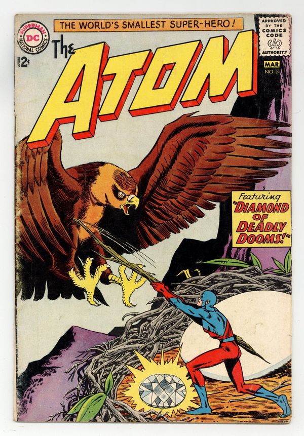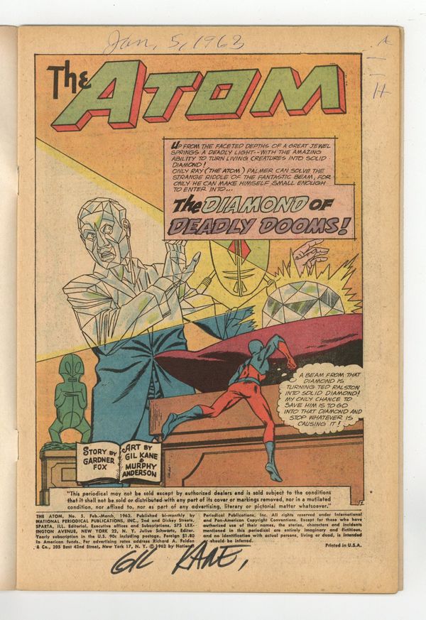 Starts Later today Cover pencils by Gil Kane, inks by Murphy Anderson. "The Diamond of the Deadly Dooms!", script by Gardner Fox, pencils by Gil Kane and Mike Sekowsky (pp. 4-9), inks by Murphy Anderson; Ray Palmer's colleague Ted Ralston finds an ancient diamond and takes it home; When examining the diamond, it shoots a beam that changes him and his cat into beings of pure diamond; Shrinking down to a microscopic size, the Atom penetrates the atoms of the diamond and finds a microscopic civilization. "The Specter of 3000-Moons Lake!", script by Gardner Fox, pencils by Gil Kane, inks by Murphy Anderson; Ray Palmer, and Jean Loring accompany millionaire Don Morgan to where he keeps his cottage at 3000-Moons Lake; There a series of strange thefts and supernatural activity have become subject of debate. 36 pgs., full color. $0.12. Cover price $0.12. Grade: GD 2.0 explanation of grade Condition: Used (collectible)