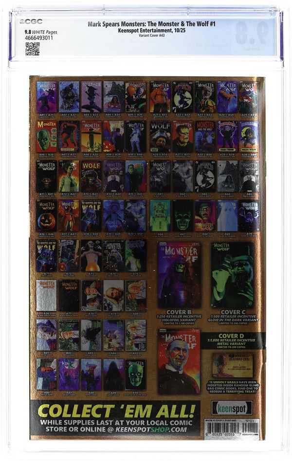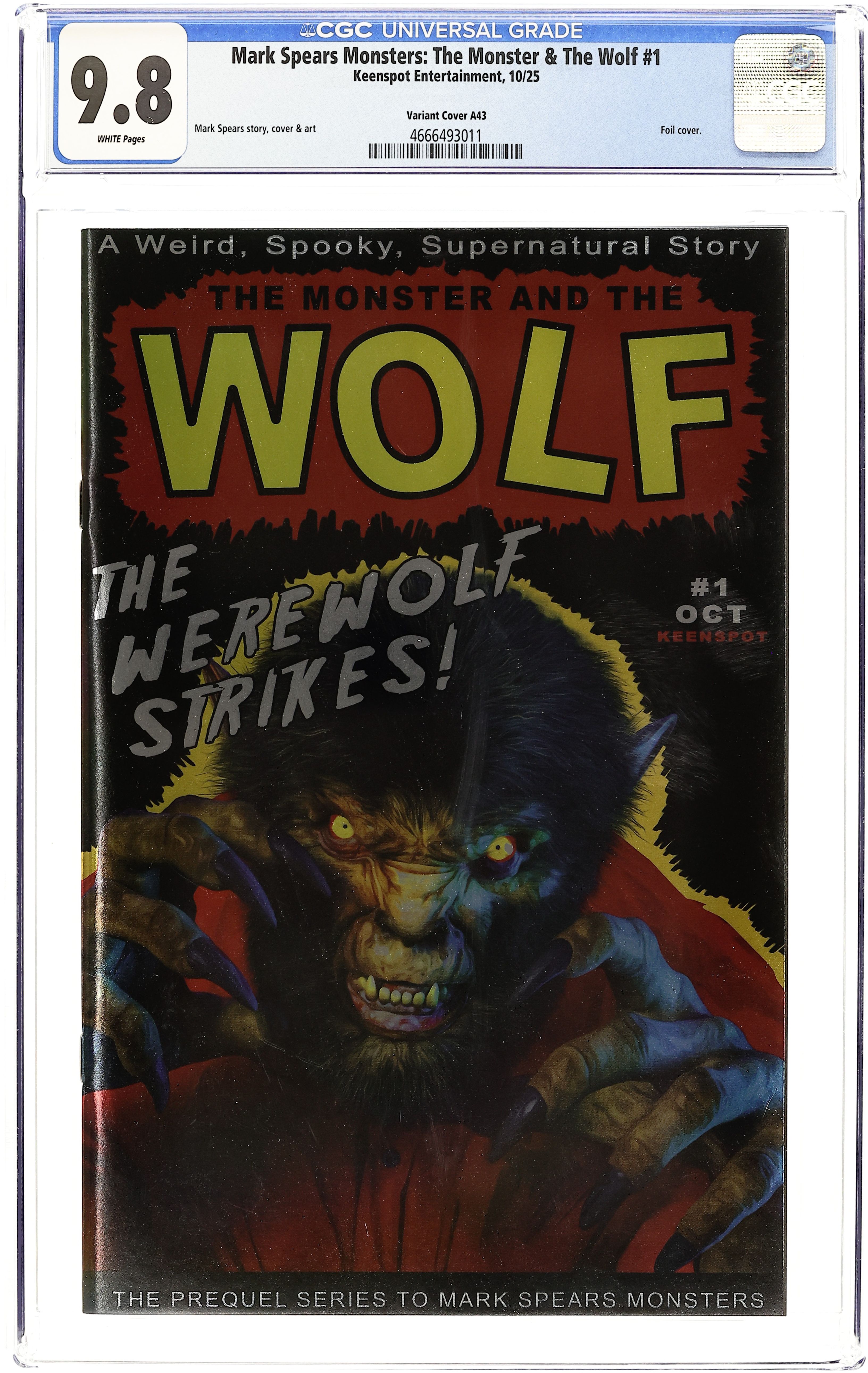 Starts Mar 23 Trick or Treat Blind Bag Exclusive "A43" Foil Edition Variant Cover by Mark Spears. (W) Mark Spears (A) Mark Spears. From the creator of the hit series Mark Spears Monsters comes this new prequel mini-series written and illustrated by Mark Spears! In a desperate attempt to find a cure to the werewolf curse that haunts him, Clint Abbott's journey leads him to the bitter cold of the Arctic. Through the snow and ice, he senses something is stalking him... but not everything is as it seems. NOTE: Cover A is a BLIND BAG randomly packed with one of more than TWENTY exclusive cover variants by Mark Spears, many of them incredibly rare! (This is a Keenspot publication.) Grade: CGC 9.8 explanation of grade Condition: Used (collectible) unless item is a new release