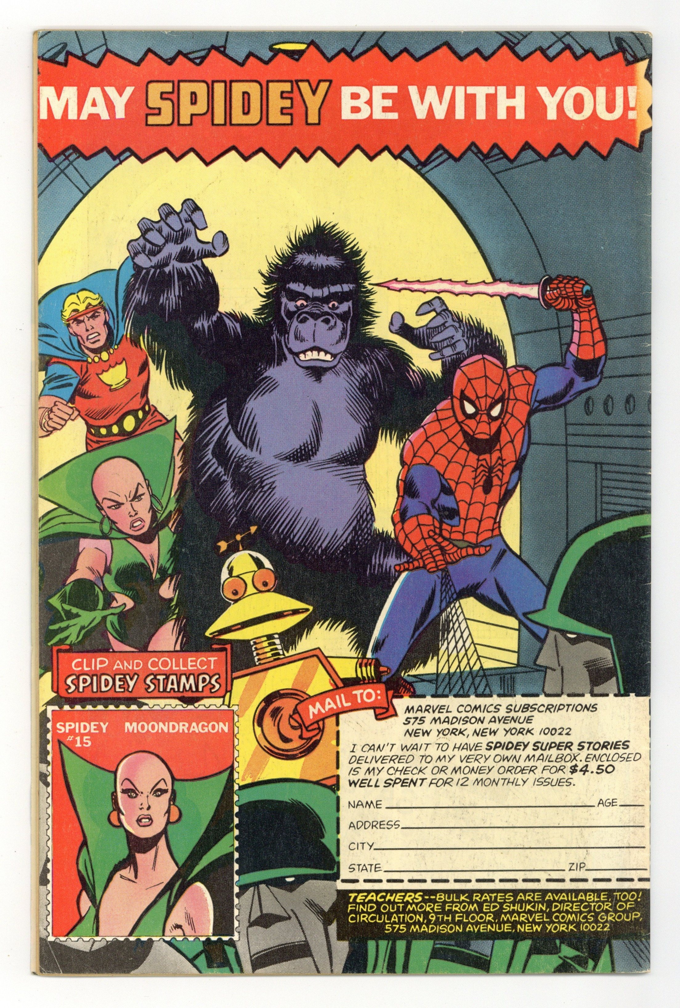 Starts Mar 16 "Star Jaws!" Guest-starring Moondragon and Marvel Boy. Story by Kolfax Mingo. Art by Winslow Mortimer, and Mike Esposito Cover by Sal Buscema. Can Spidey and the psychic Moondragon stop the nefarious Doctor Doom from destroying the world? Includes the 1-page features "She's Bald and She's Beautiful" and "He's Out of this World." Includes the back-up tale "The Big Tow!" Guest-starring the cast of the Electric Company. Featuring the clip and collect Spidey Stamp: #15 Moondragon. Cover price $0.35. Grade: VG+ 4.5 explanation of grade Condition: Used (collectible)