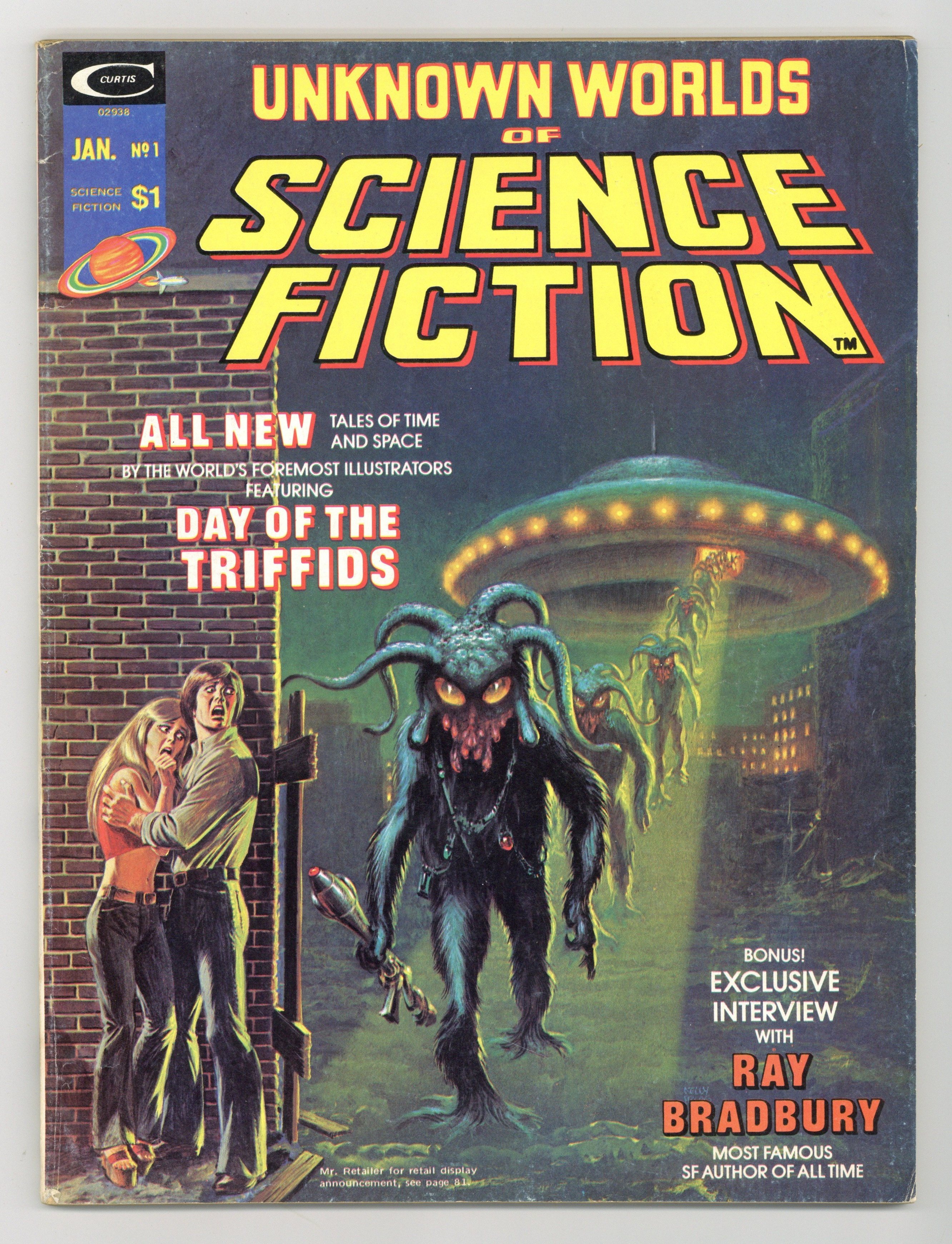 Cover by Kelly Freas and John Romita. "Slow Glass." 5 pages. Concept by Bob Shaw. Script by Tony Isabella. Pencils by Gene Colan. Inks by Tom Palmer. Framing sequence for stories in anthology. "Day of the Triffids." 15 pages. Part 1 of 2. Based on the book by John Wyndham. Script by Gerry Conway. Pencils by Ross Andru. Inks by Ernie Chua. After a meteor shower blinds almost everyone on Earth, giant mobile plants called Triffids attempt to finish off the human race. "A view from without." 8 pages. Story and art by Neal Adams. Humanitys propensity for war and self destruction is examined by an impartial alien observer. Interview with author Ray Bradbury. 10 pages. "Smash Gordon." 4 pages. Story and art by Frank Brunner. Flash Gordon spoof. "Savage world." 8 pages. Story by Wally Wood. Art by Al Williamson. An atomic bomb test leads to an encounter with a subterranean race. Interview with artist Kelly Freas. 4 pages. "Hey buddy, can you lend me a…." 5 pages. Story and art by Mike Kaluta. The last people on Earths fate rests on… a phone call. "Light of other days." 7 pages. Based on a story by Bob Shaw. Script by Tony Isabella. Pencils by Gene Colan. Inks by Mike Esposito. A substance called slow glass allows a couple to see the past. But there is no guarantee theyll enjoy what they see. 80 pages. B&W. Cover price $1.00. Grade: VG 4.0 explanation of grade Condition: Used (collectible)