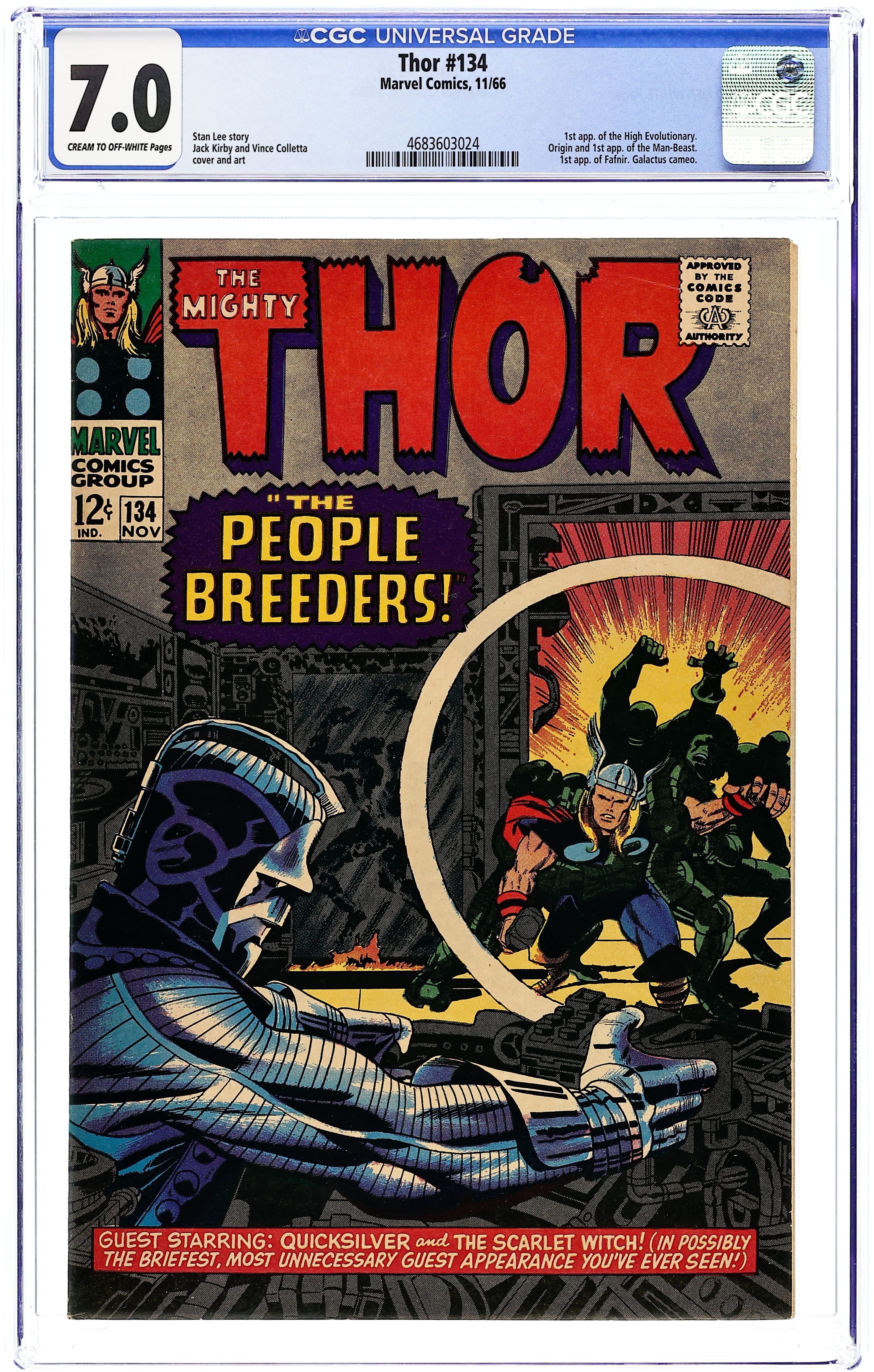 Cover pencils by Jack Kirby, inks by Vince Colletta. First appearances by the High Evolutionary and the Man-Beast in "The People-Breeders!", script by Stan Lee, pencils by Jack Kirby, inks by Vince Colletta; Appearances by Quicksilver, the Scarlet Witch, the Recorder, and Jane Foster; Galactus cameo. Tale of Asgard: "When Speaks the Dragon!", script by Stan Lee, pencils by Jack Kirby, inks by Vince Colletta; Thor and companions inspect Nastrond for Odin. Volstagg wanders off and finds Fafnir. Marvel Super-Heroes Are On TV! ad. 36 pgs., full color. $0.12. Cover price $0.12. Grade: CGC 7.0 explanation of grade Condition: Used (collectible)