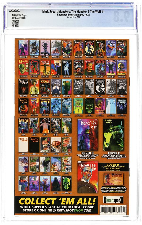 Starts Apr 4 Trick or Treat Blind Bag Exclusive "A04" Edition Variant Cover by Mark Spears. (W) Mark Spears (A) Mark Spears. From the creator of the hit series Mark Spears Monsters comes this new prequel mini-series written and illustrated by Mark Spears! In a desperate attempt to find a cure to the werewolf curse that haunts him, Clint Abbott's journey leads him to the bitter cold of the Arctic. Through the snow and ice, he senses something is stalking him... but not everything is as it seems. NOTE: Cover A is a BLIND BAG randomly packed with one of more than TWENTY exclusive cover variants by Mark Spears, many of them incredibly rare! (This is a Keenspot publication.) Grade: CGC 9.8 explanation of grade Condition: Used (collectible) unless item is a new release