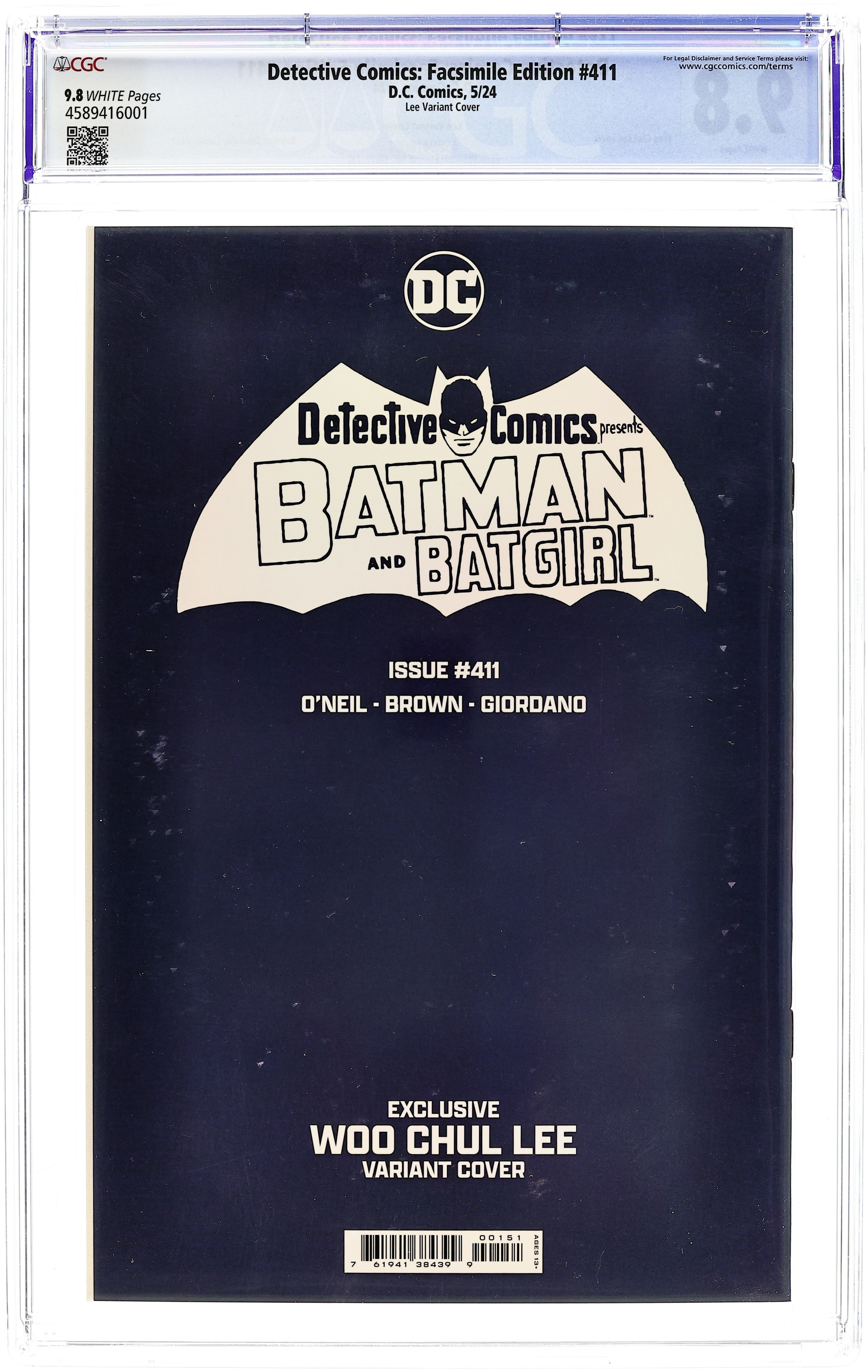 Starts Apr 4 Variant Cover by Woo Chul Lee. Written by Dennis O Neil. Art by Bob Brown, Dick Giordano. In pursuit of Dr. Darrk and the League of Assassins, Batman finds himself on a trail that stretches from the top of the Statue of Liberty to an abandoned Buddhist monastery in Asia, in this full facsimile reprinting of Talia al Ghul's first-ever comic book appearance. Also features the Batgirl story, Cut...and Run. 32 pages, full color. Rated T+ Grade: CGC 9.8 explanation of grade Condition: Used (collectible)