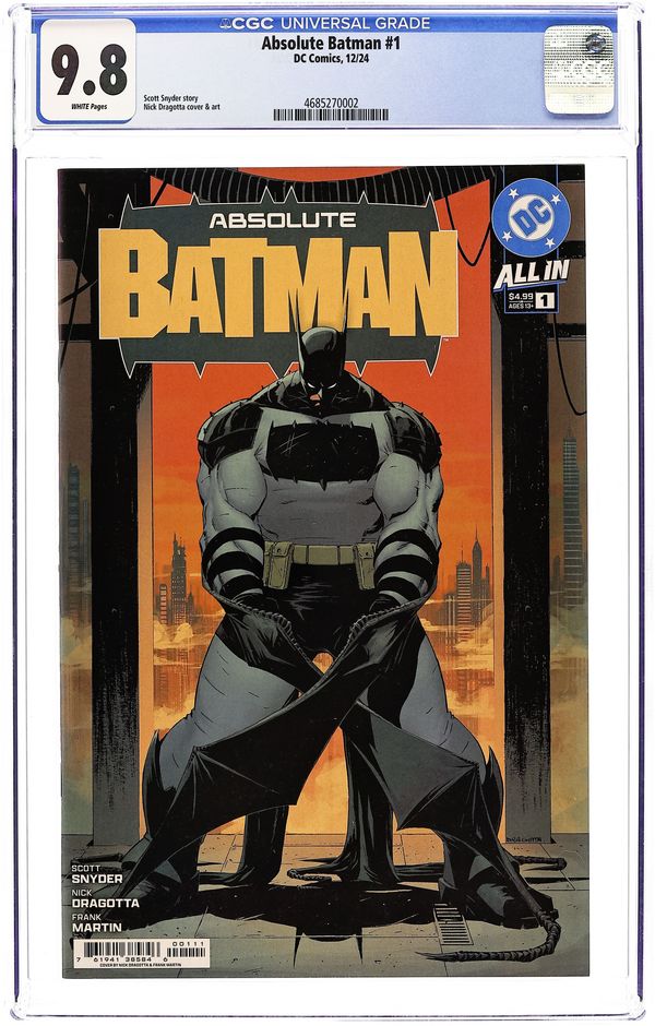 Written by Scott Snyder. Art by Nick Dragotta. Cover by Nick Dragotta. BATMAN LEGEND SCOTT SNYDER AND ICONIC ARTIST NICK DRAGOTTA TRANSFORM THE DARK KNIGHT'S TALE FOR THE MODERN AGE! Without the mansion...without the money...without the butler...what's left is the Absolute Dark Knight! 44 pages, full color. Rated T+ Cover price $4.99. Grade: CGC 9.8 explanation of grade Condition: Used (collectible)