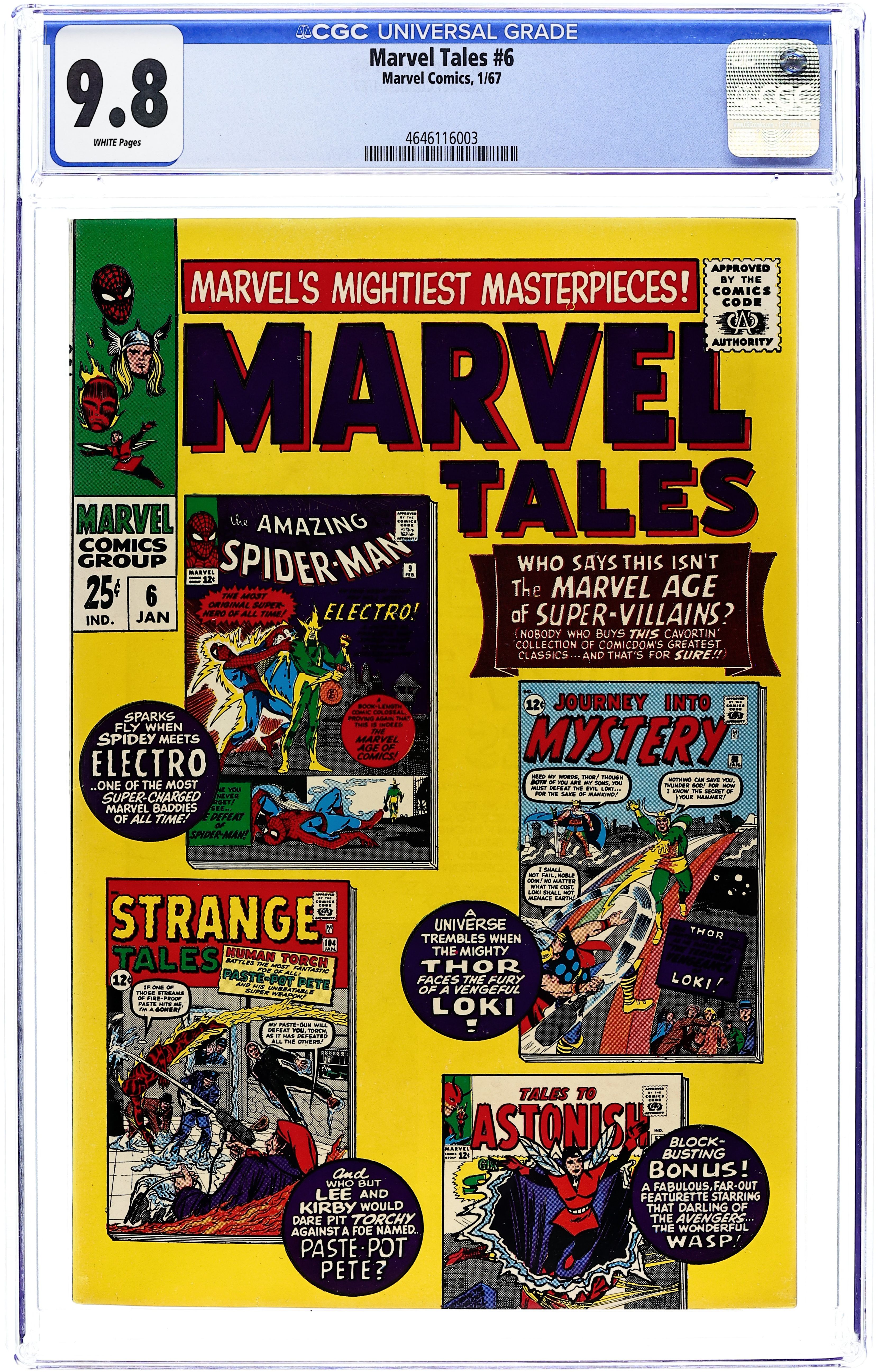Reprints: Amazing Spider-Man #9 featuring "The Man Called Electro." Story by Stan Lee. Art by Steve Ditko. Strange Tales #103 starring the Human Torch (Johnny Storm of the Fantastic Four) in "The Human Torch meets Paste-Pot Pete!" Story by Stan Lee and Larry Lieber. Art by Jack Kirby and Dick Ayers. Journey into Mystery #87 starring the Mighty Thor in "The Vengeance of Loki!" Story by Stan Lee and Larry Lieber. Art by Jack Kirby and Dick Ayers. Tales to Astonish #57 starring the Wasp in "The Voice in the Dark!" Story by Stan Lee and Larry Lieber. Art by Larry Lieber and Chic Stone. Cover price $0.25. Grade: CGC 9.8 explanation of grade Condition: Used (collectible)