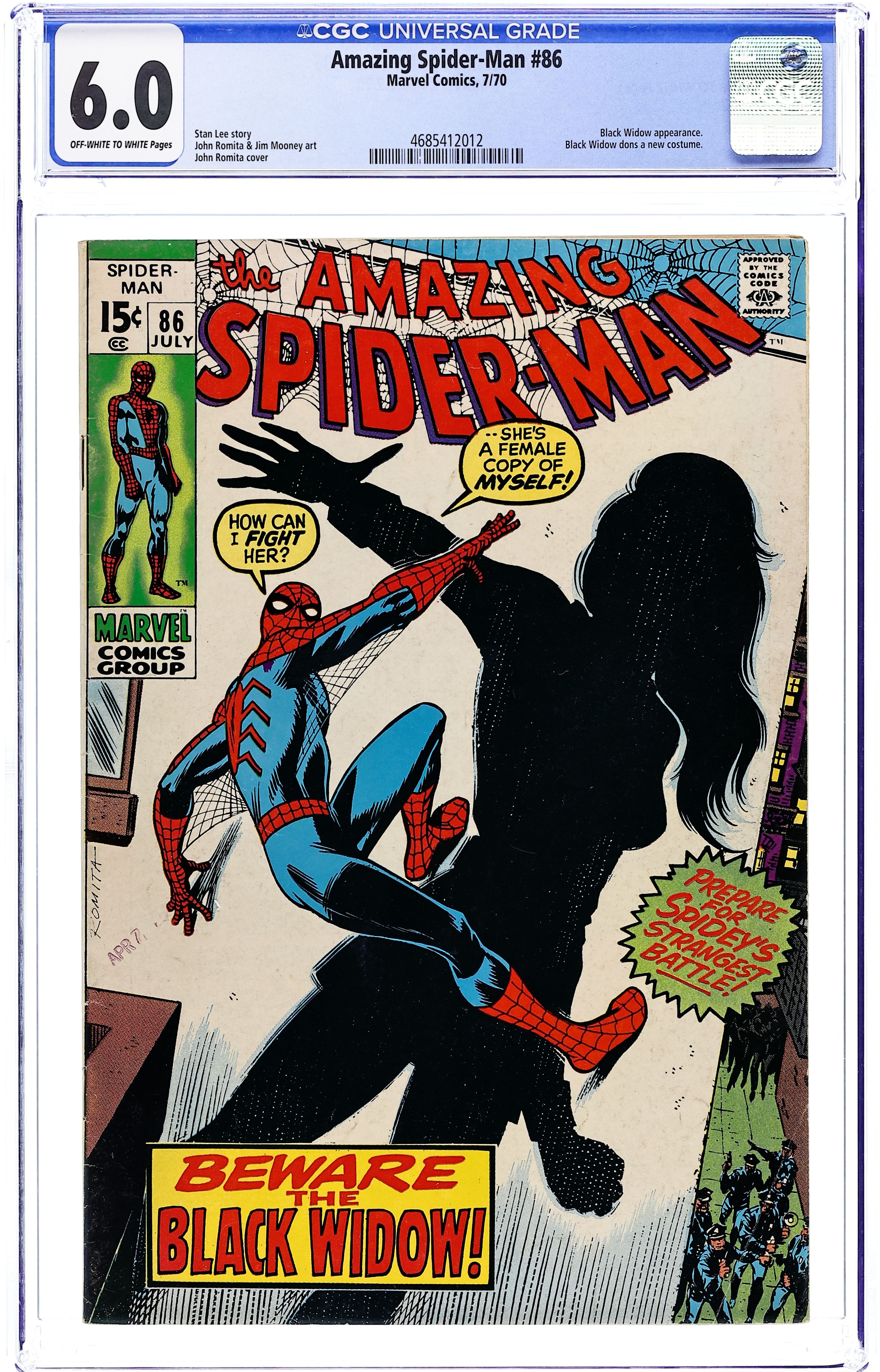 First appearance of the Black Widow's classic black costume in "Beware the Black Widow!" Guest-starring the Black Widow. Script by Stan Lee. Art by John Romita (layouts) and Jim Mooney (finishes). Cover by John Romita. Natasha Romanoff is ready to get back in the superhero game! But there are two things she must do first. One...design a new costume; and two...learn the secrets of the wondrous wall-crawler! So to that end the widow lays a trap for the web-slinger! Will the Amazing Spider-Man get caught in the web of the beautiful Black Widow? Retelling of the Black Widow's origin. Cameo appearances by Captain Stacy, Gwen Stacy, Harry Osborn, Aunt May, Anna Watson, and J. Jonah Jameson. Flashback cameos by Iron Man, Hawkeye, and the Red Guardian. (Notes: The Black Widow appears next in Amazing Adventures (1970 2nd series) #1. Spider-Man and the Black Widow meet again in Daredevil (1st series) 103. This issue was reprinted in Marvel Tales #67.) 36 pages. Cover price $0.15. Grade: CGC 6.0 explanation of grade Condition: Used (collectible)