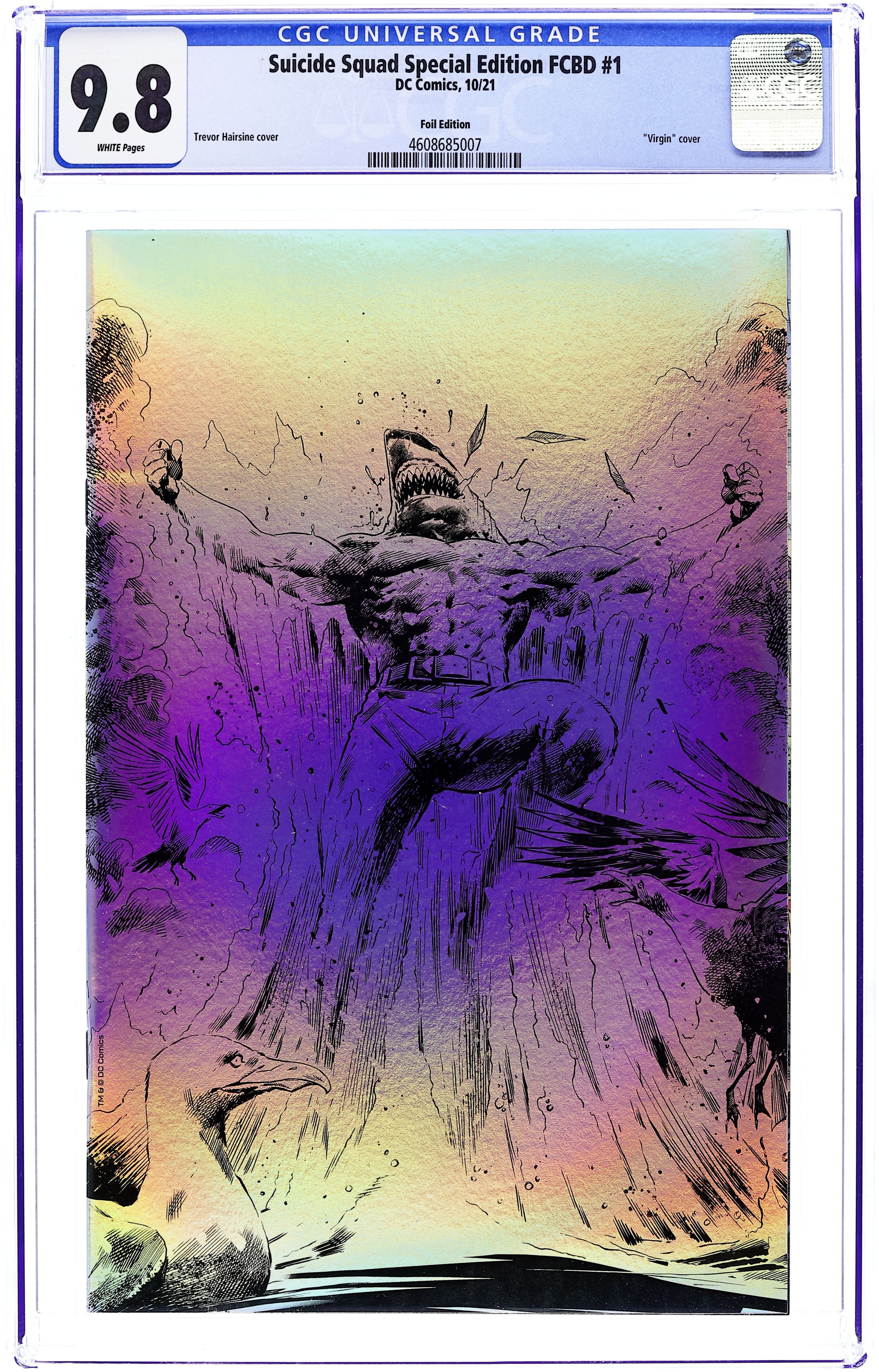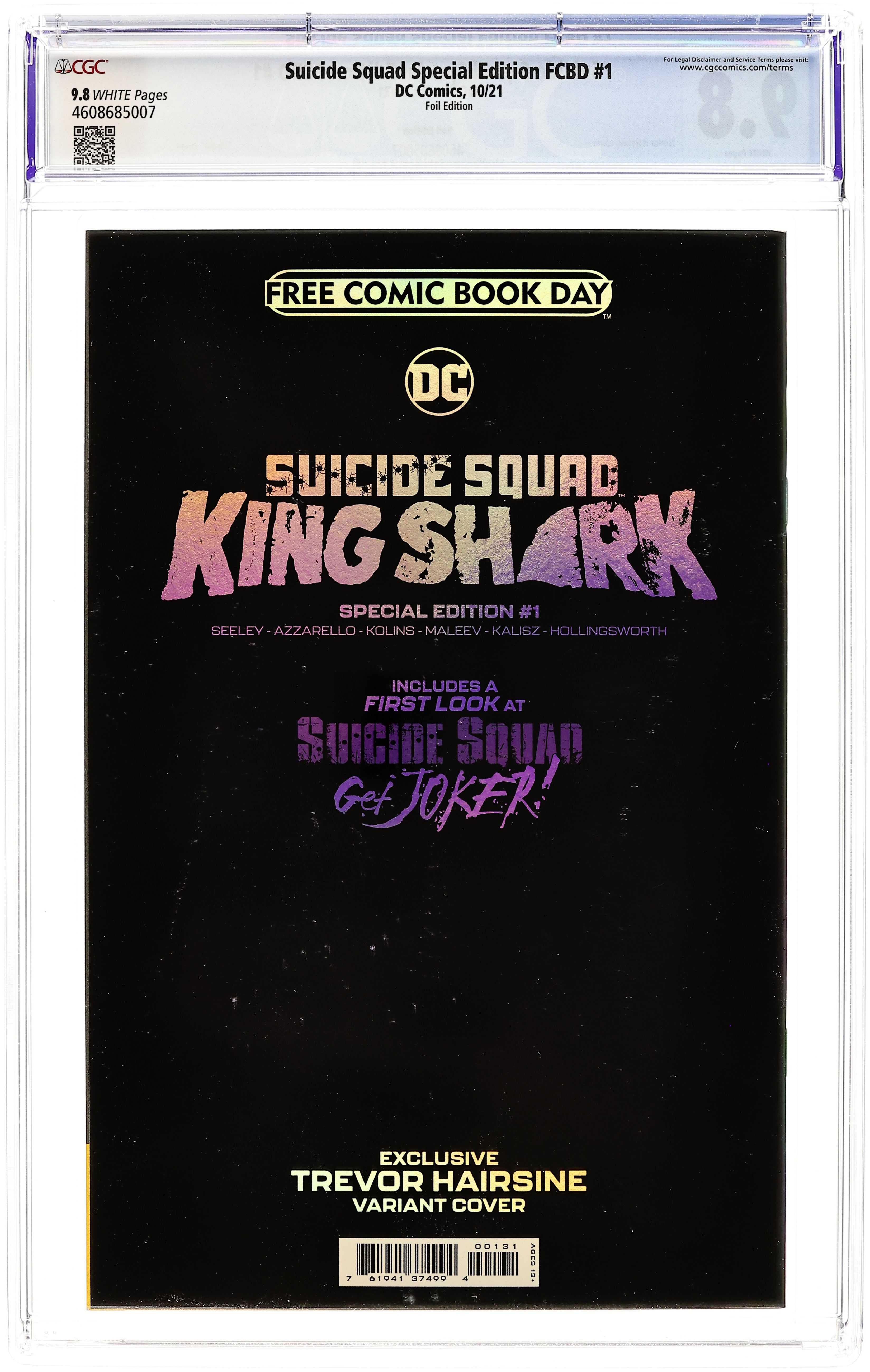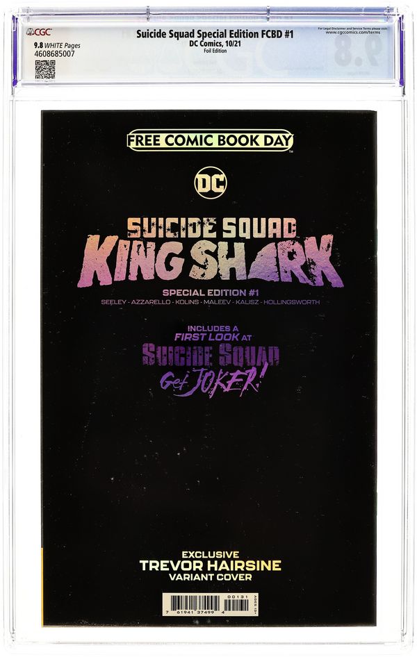Starts Apr 4 Limited 1 for 500 Retailer Incentive Variant Cover. Written by Tim Seeley and Brian Azzarello. Art by Scott Kolins and Alex Maleev. Cover by Trevor Hairsine. Get ready for The Suicide Squad written and directed by James Gunn, which releases in theaters and HBO Max on August 6th, with this incredible Special Edition that features the world's deadliest villains. Discover more about the breakout character from Task Force X in a SUICIDE SQUAD: KING SHARK story by Tim Seeley and Scott Kolins. This issue also includes a preview of the sensational SUICIDE SQUAD: GET JOKER! limited series by Brian Azzarello and Alex Maleev. An incarcerated and angry Red Hood receives a chance at freedom from Amanda Waller. All the former Boy Wonder needs to do to gain his release is lead the Suicide Squad on a mission to terminate The Joker. Paired up with Harley Quinn and Gotham City killers such as Firefly and Killer Croc, he doesn't care if any of them come back alive, as long as The Joker dies! 32 pages, full color. Ages 13+ Grade: CGC 9.8 explanation of grade Condition: Used (collectible)