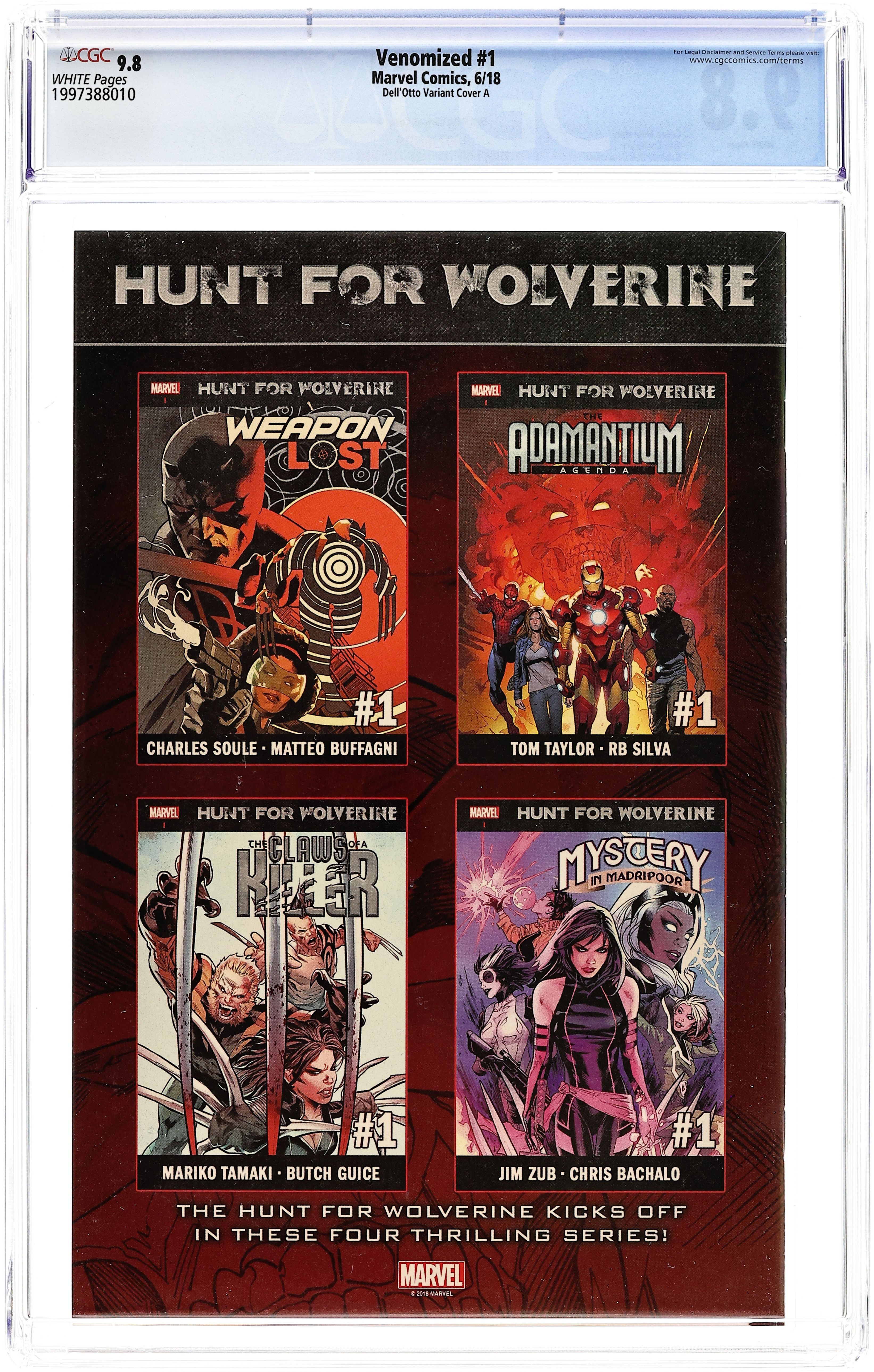 Starts Mar 23 Limited 1 for 50 Retailer Incentive Variant Cover. Written by Cullen Bunn. Art by Iban Coello. Cover by Gabriele Dell'Otto. VENOMIZED Part 1 The story that began in VENOMVERSE reaches its epic conclusion with VENOMIZED! The POISONS, a species that hungers for super-powered symbiotes and their hosts, have picked their next target...THE MARVEL UNIVERSE ITSELF! Their first objective? Put every superhuman in a Klyntar symbiote - and CONSUME THEM! But with VENOM and the X-MEN still missing after the events of 'Poison-X,' the planet, and its heroes, is defenseless! 36 pages, full color. Rated T+ Cover price $4.99. Grade: CGC 9.8 explanation of grade Condition: Used (collectible)