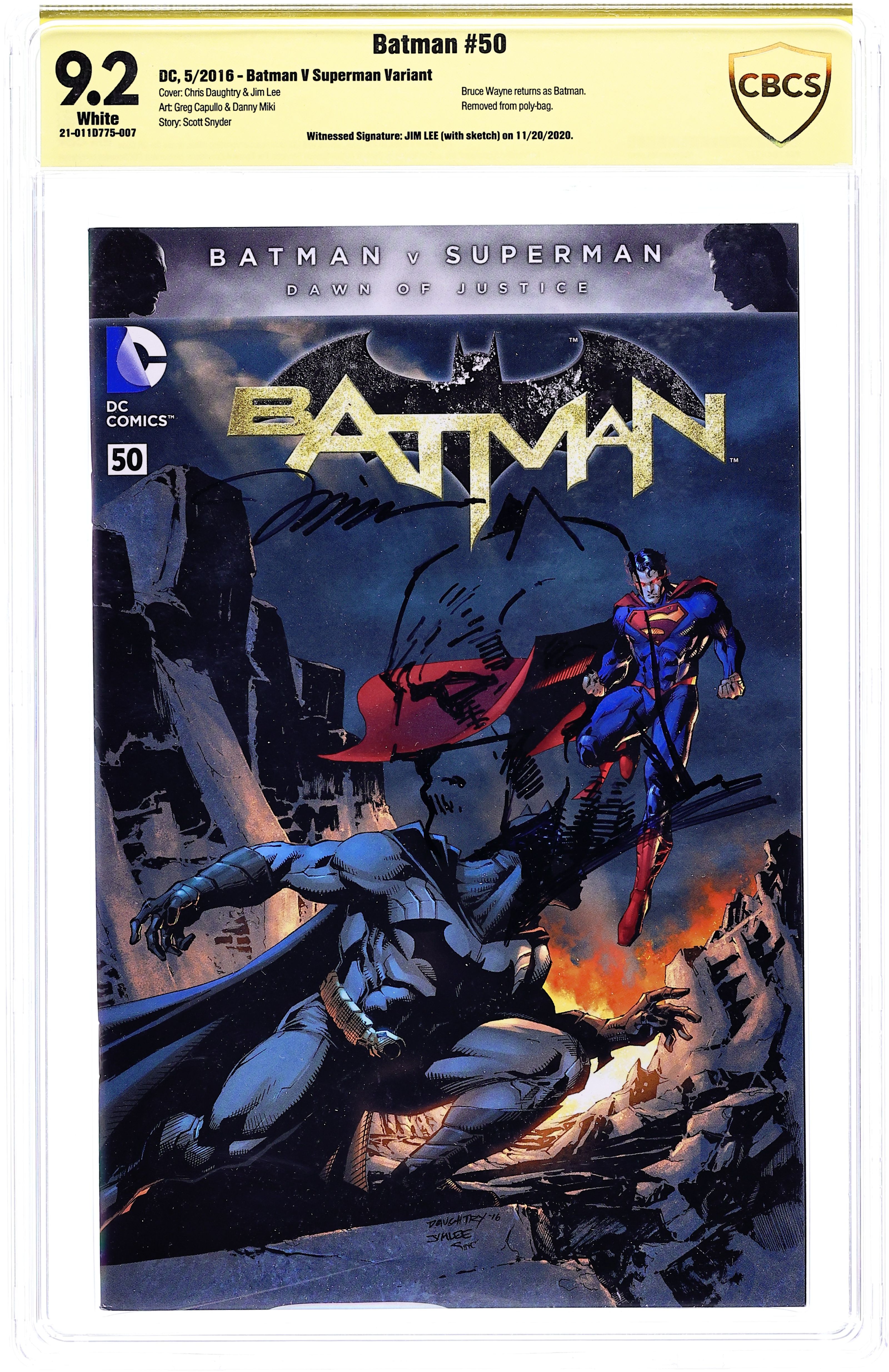 Witnessed Signature: Jim Lee (with sketch) on 11/20/2020. Batman V Superman Variant.