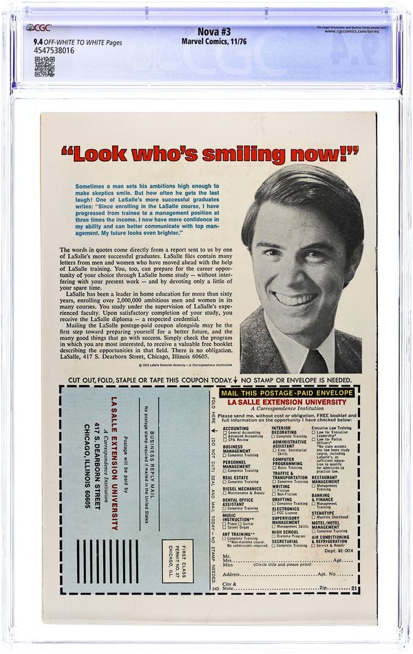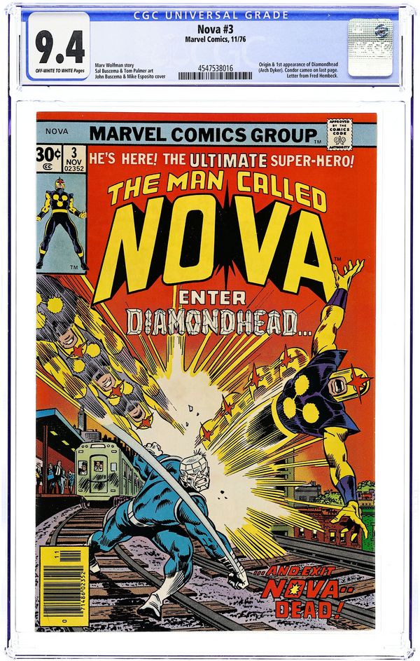 "Enter Diamondhead!" Story by Marv Wolfman. Art by Sal Buscema and Tom Palmer. Richard Rider learns that the subtleties of keeping his powers a secret from his friends and family will be harder than he thinks. Plus, Nova discovers a new power, he's bullet proof. And good thing to because now he must confront the nigh unstoppable might of Diamondhead. 32 pages. Cover price $0.30. Grade: CGC 9.4 explanation of grade Condition: Used (collectible)