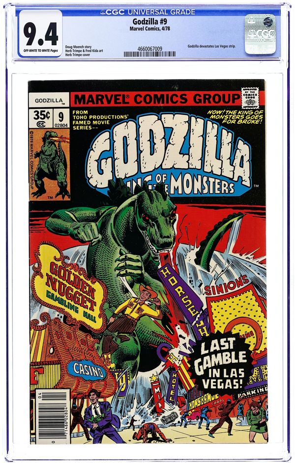 "The Fate of Las Vegas!" Story by Doug Moench. Art by Herb Trimpe and Fred Kida. The lumbering leviathan's travels have brought him to the City of Lights. Can Las Vegas survive a rampage by the King of all Monsters? Don't bet on it. Cover price $0.35. Grade: CGC 9.4 explanation of grade Condition: Used (collectible)