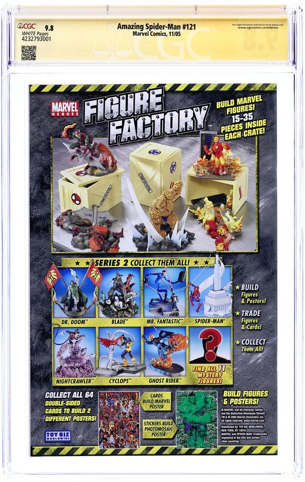 Starts Apr 4 2005 reprint edition that originally came packaged with Toy Biz Marvel Legends Masterworks - The Battle For Gwen Stacy. Re-uses the Alex Ross painted cover from Marvels #0 (1994) from which the action figure set "Famous Covers Come To Life" drew its inspirational design. Also, the original cover to #121 is reproduced on the first page with a black border around it. Full color reprint. Note: This reprint is dated 2005 in the indica and contains new advertising and other changes so that it cannot be easily confused with the original comic. Grade: CGC 9.8 explanation of grade Condition: Used (collectible)