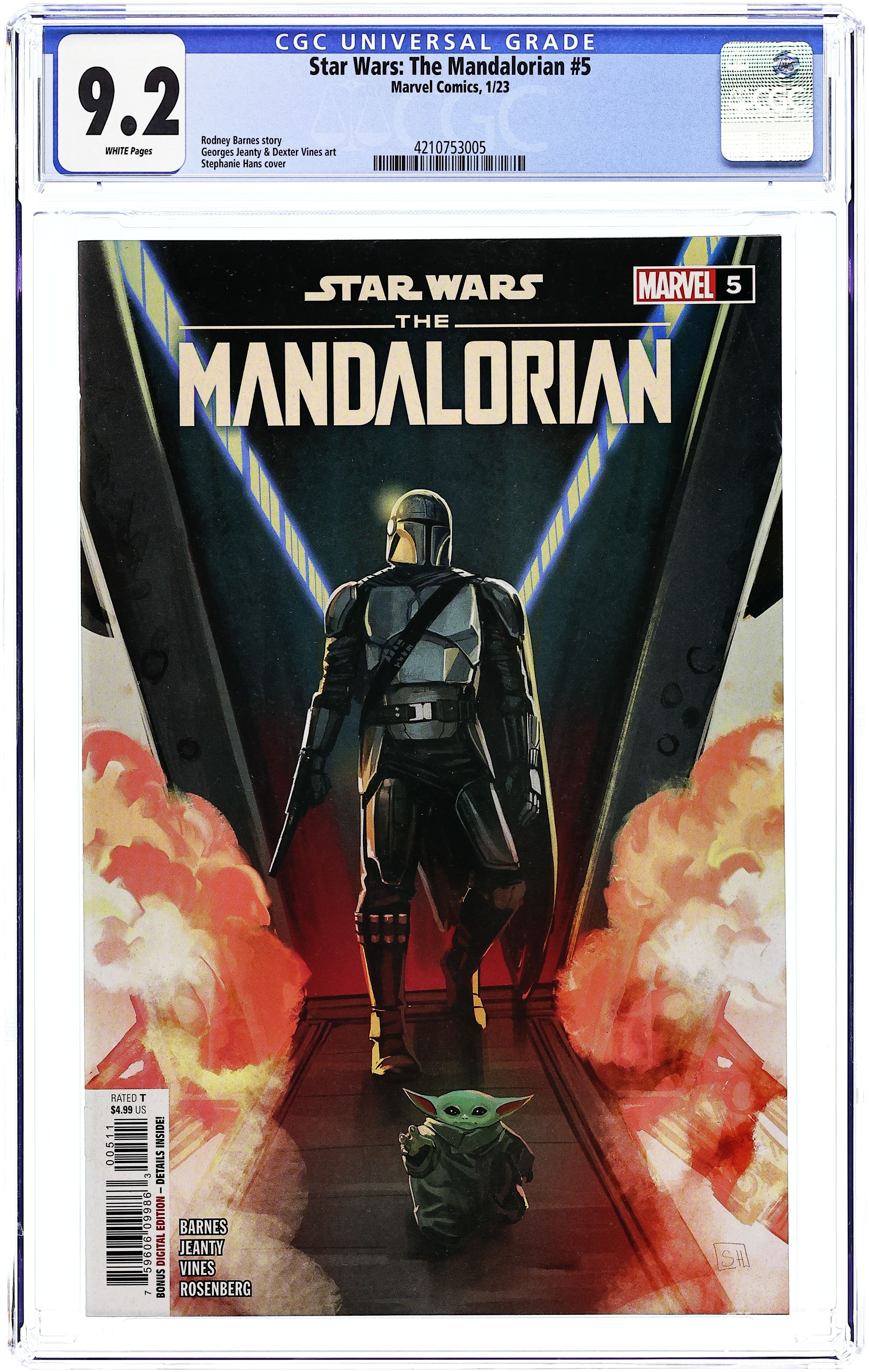 Written by Rodney Barnes. Art by Georges Jeanty. Cover by Stephanie Hans. "THE GUNSLINGER"! On a familiar desert planet, the Mandalorian helps a rookie bounty hunter who is in over his head. 36 pages, full color. Rated teen Cover price $4.99. Grade: CGC 9.2 explanation of grade Condition: Used (collectible)