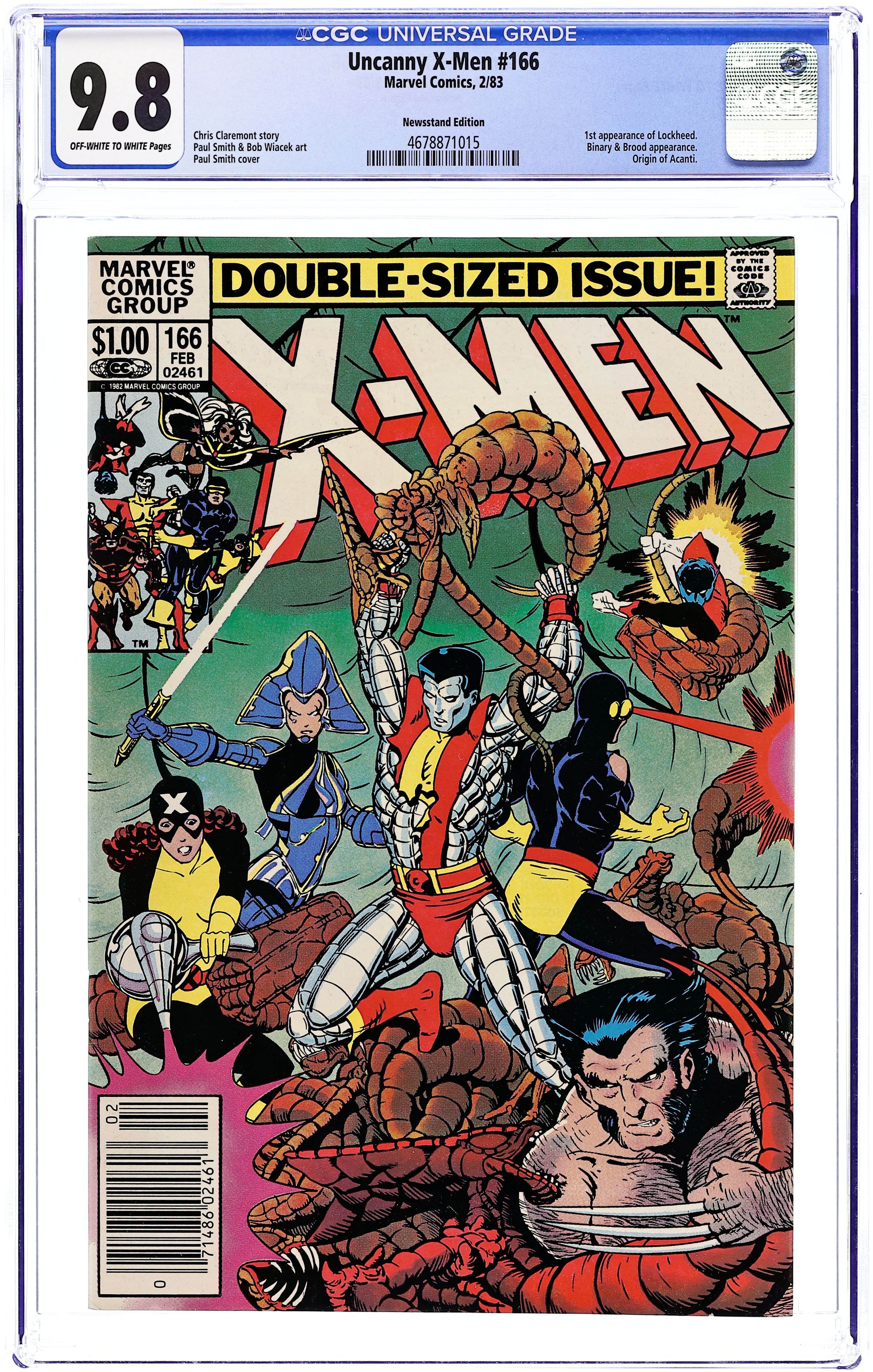 Newsstand Edition. Part 5 of 6. Story by Chris Claremont. Art by Paul Smith and Bob Wiacek. It's the final battle between the sinister Brood and the Uncanny X-Men. But when the Earth heroes learn a startling secret about their mentor, Professor X, they discover that they may already be too late to save their home world. First appearance of Lockheed. 52 pgs. Cover price $1.00. Grade: CGC 9.8 explanation of grade Condition: Used (collectible)