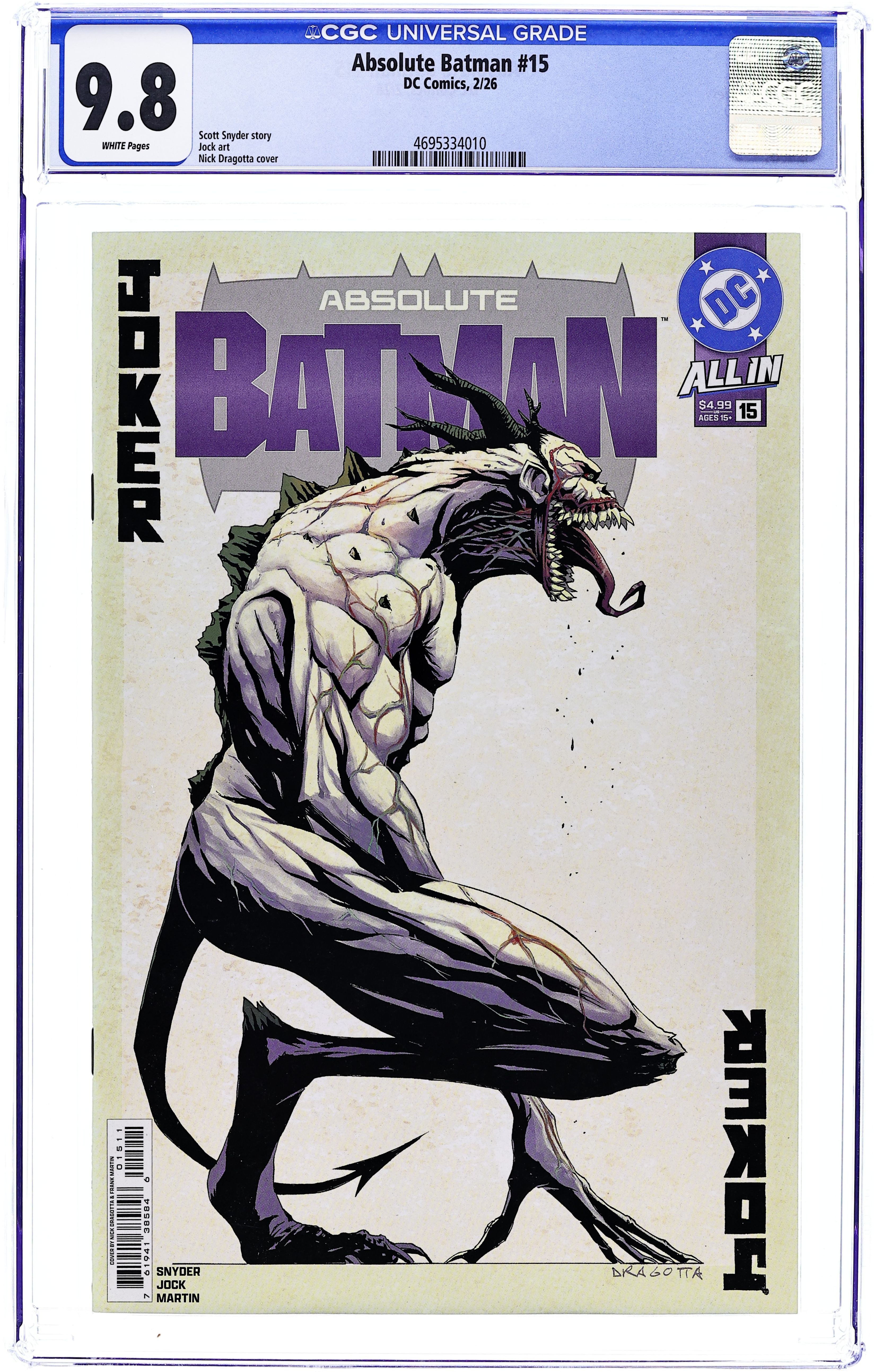 Starts Apr 4 (W) Scott Snyder (A) Jock (CA) Nick Dragotta SCOTT SNYDER REUNITES WITH LEGENDARY ARTIST JOCK! Alfred reveals to Bruce the story of the man hes been chasing for years. Enter: Joker! Scott Snyder and Jock reunite for an epic tale in the Absolute Universe! 32 pages, full color, rated 15+. Cover price $4.99. Grade: CGC 9.8 explanation of grade Condition: Used (collectible) unless item is a new release