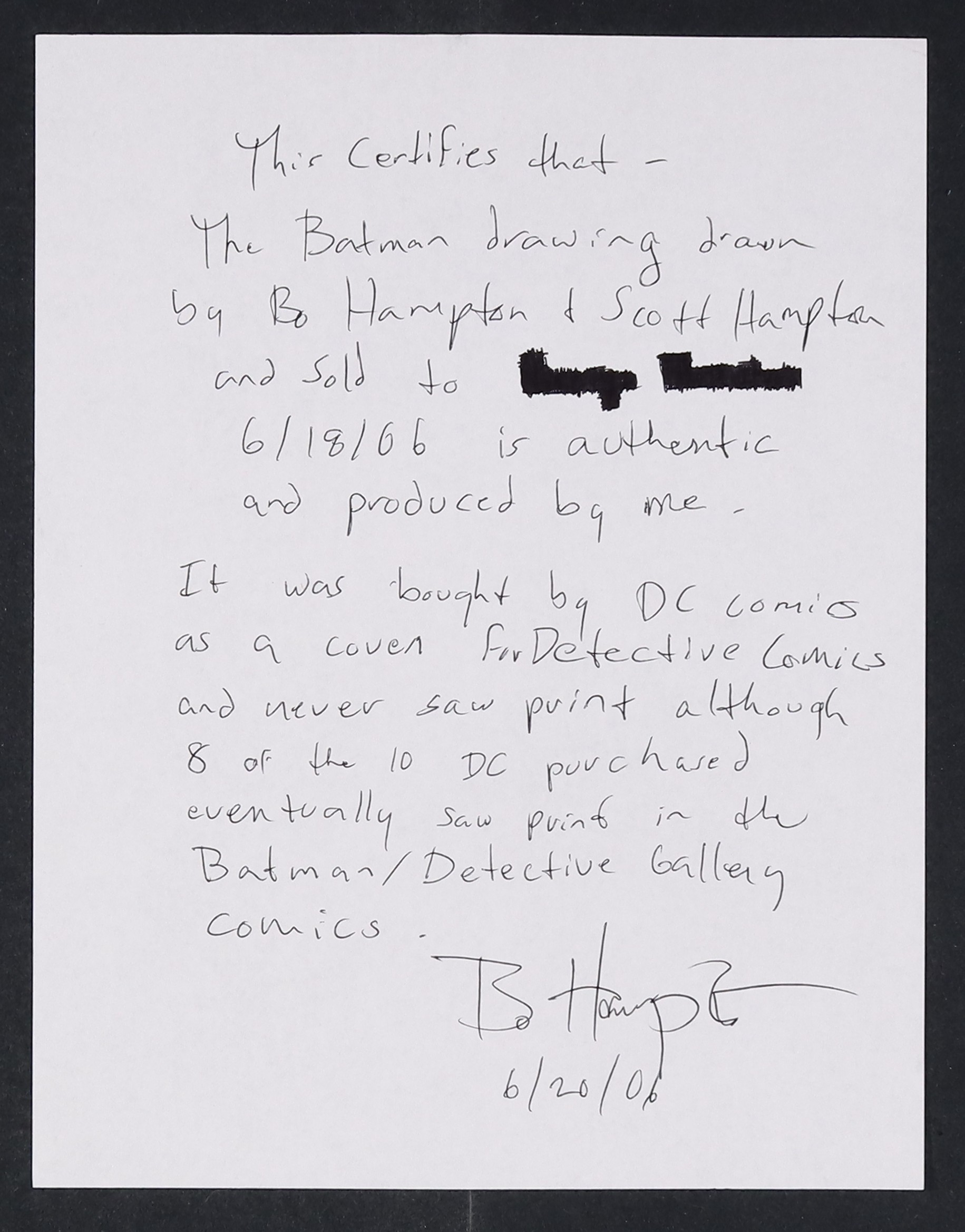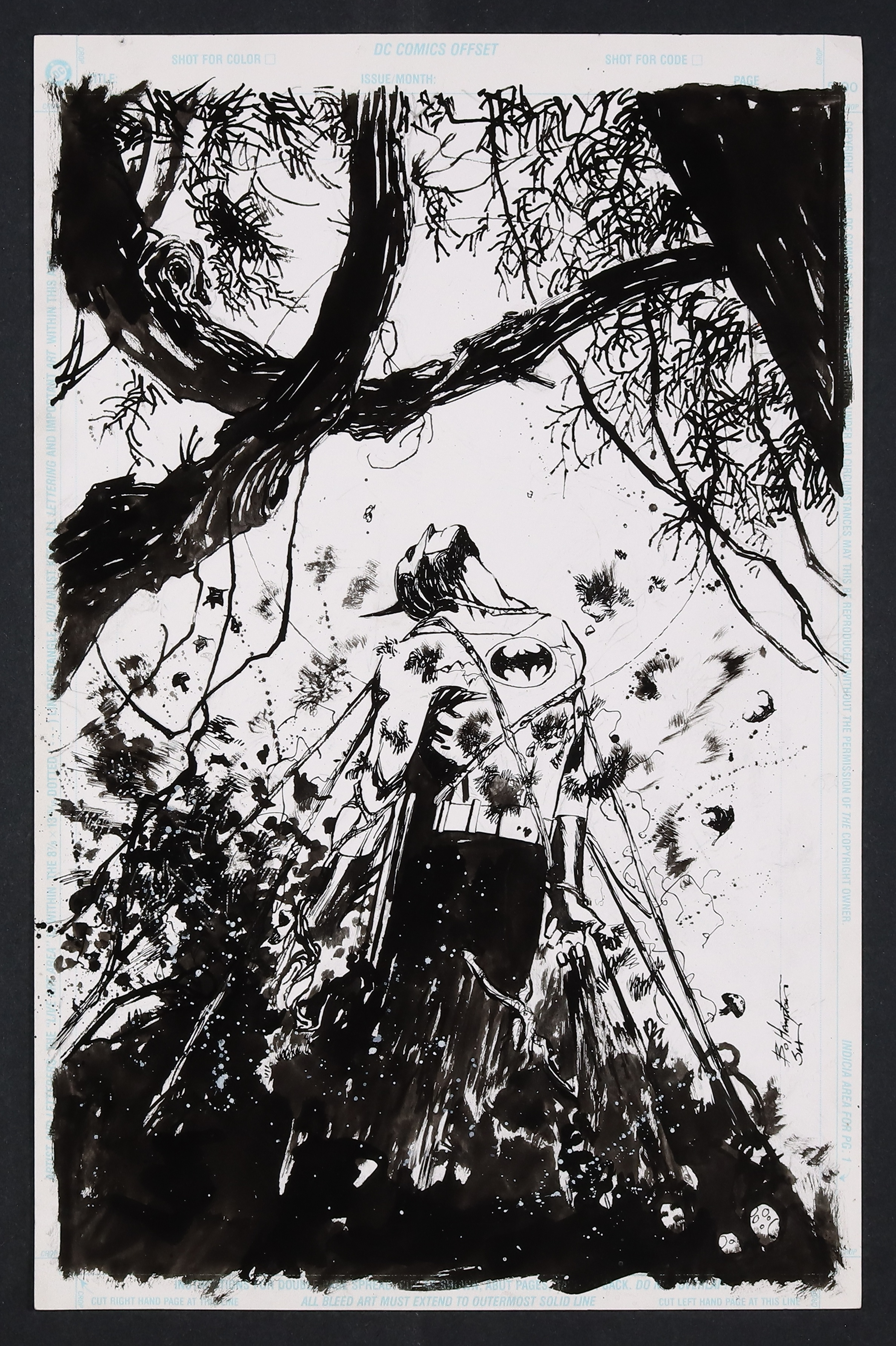A beautiful, richly textured piece from the brothers Hampton that sadly did not see print! Likely intended for a story involving Poison Ivy, the Hamptons do a brilliant job of contrasting the iconic figure of the Batman, typically found in concrete jungles, with the all-consuming and ever cycling growth of plant life. Signed by the artists in lower right margin. Also included is a letter of authenticity from Bo Hampton indicating the provenance of the piece. The original buyer's name has been redacted from the letter by MyComicShop at their request. Pencil and ink on DC Comics art board. 11" x 17".