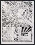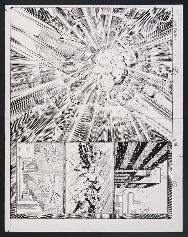 An Incredible double page spread from two masters of comic art signals the official start of World War Hulk! After quickly dispatching Black Bolt on the moon and sending a message to earth demanding the presence of the Illuminati who shot him into space, it's time smash! Iron Man, clad in his Hulkbuster armor, and the Hulk collide in midair, sending shockwaves through New York City as some of the world's most powerful heroes cower in fear. The art is absolutely stunning in its original form, especially the care and detail put into the shockwaves in the central image. Pencil and ink on two sheets of Marvel Comics art board affixed to each other on the reverse with masking tape. 22" x 17 1/4".
