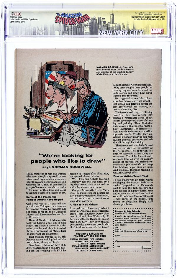 Starts Apr 4 Cover art by John Romita. How Green Was My Goblin!, script by Stan Lee, pencils by John Romita (who begins as regular penciler), inks by Mike Esposito [as Mickey Demeo] and John Romita (touch-ups); Peter heads to the doctor with the sniffles and learns that Aunt May's health is very fragile; Spidey is roped into tangling with a bunch of goons who zap him with a mysterious gas; Not realizing that the gas has weakened his spider sense, he changes into Peter Parker under the watchful gaze of the Green Goblin; The Goblin confronts Spidey outside of his home and captures him as Peter is worried that Aunt May might be overcome by the commotion; Trussed up in the Goblin's lair, Peter is shocked when the Goblin takes off his mask and reveals himself to be Norman Osborn. Reprinted in Marvel Tales # 178. According to Les Daniels in "Marvel: Five Fabulous Decades of the World's Greatest Comics" (Abrams, 1991), artist Steve Ditko resigned because of a disagreement over the Goblin's identity. Ditko wanted it to be someone anonymous--a new, unknown guy; Lee wanted it to be a familiar character that would startle readers. 36 pgs. $0.12. Cover price $0.12. Grade: CGC 8.0 explanation of grade Condition: Used (collectible)