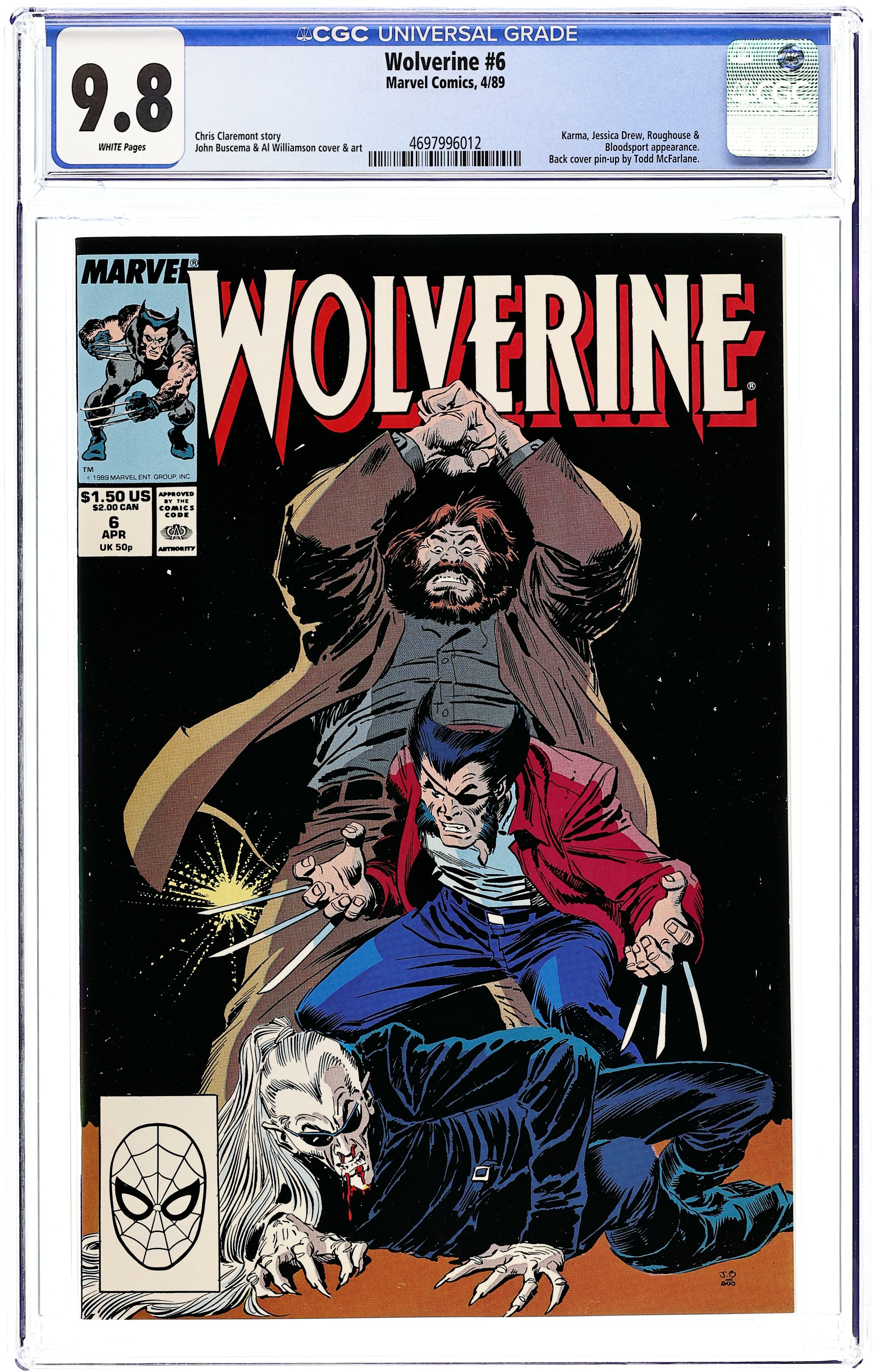 Starts Apr 4 Direct Edition. "Roughhouse!" Written by Chris Claremont. Art by John Buscema and Al Williamson. At the royal palace, Wolverine takes on the behemoth Roughhouse and the deadly Bloodsport in an effort to save innocent lives. Just as things escalate to the point of no return, the Mandripoor Prince arrives in town. Todd McFarlane art on back cover. 32 pages, FC Cover price $1.50. Grade: CGC 9.8 explanation of grade Condition: Used (collectible)