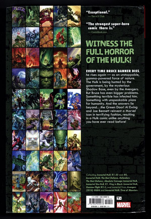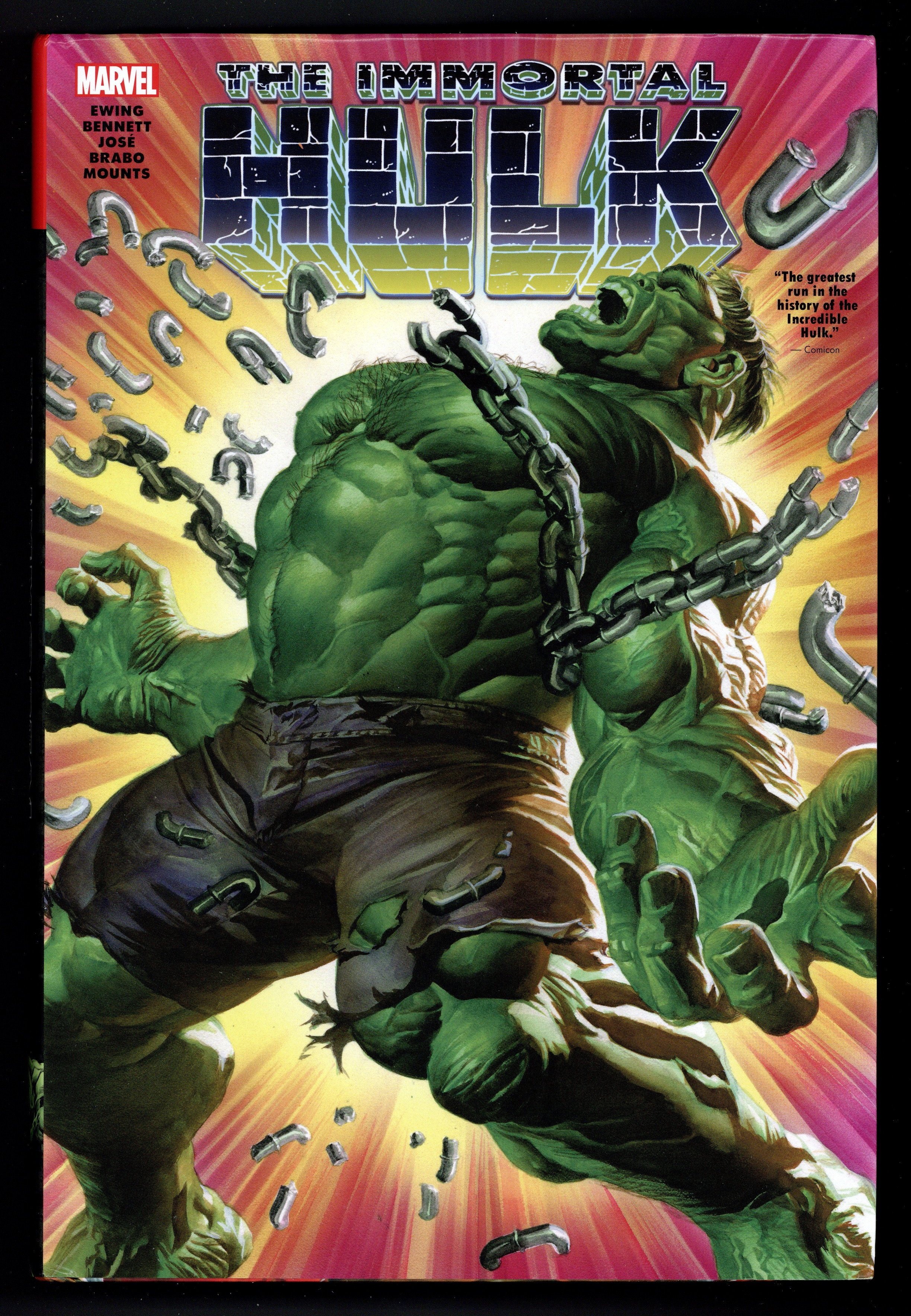 1st printing. Collects The Immortal Hulk (2018-2021 Marvel) #1-50 and #0, The Immortal Hulk: The Best Defense (2018), Defenders: The Best Defense (2018), Absolute Carnage: The Immortal Hulk (2019 Marvel), The Immortal She-Hulk (2020 Marvel), King in Black: The Immortal Hulk (2020 Marvel), Gamma Flight (2021 Marvel)#1-5 and material from Avengers (2017 7th Series) #684 and The Immortal Hulk: Time of Monsters (2021 Marvel). Written by Al Ewing, Alex Paknadel, Crystal Frasier, Bill Mantlo, and Peter David. Art by Joe Bennett, Ruy José, Le Beau Underwood, Rafael Fonteriz, Belardino Brabo, Marc Deering, Sean Parsons, Cam Smith, Eric Nguyen, Marguerite Sauvage, Garry Brown, Lee Garbett, Simone Di Meo, Martin Simmonds, Paul Mounts, Kyle Hotz, Filipe Andrade, Ryan Bodenheim, German Garcia, Tom Reilly, Matias Bergara, Javier Rodriguez, Alvaro Lopez, Mark Morales, Nick Pitarra, Butch Guice, Tom Palmer, Mattia de Iulis, Mike Hawthorne, Jon Davis-Hunt, Aaron Kuder, Alex Lins, Adam Gorham, Rachel Stott, Juan Ferreyra, Lan Medina, Mike Mignola, Bob Sharen, Jim Novak, Adam Kubert, Mark Farmer, Dan Brown, and John Workman. Flashback Panels by Stan Lee, Jack Kirby, Steve Ditko, Paul Reinman, Dick Ayers, and Art Simek.. Cover by Alex Ross. Is he man or monster...or is he both? Find out as Al Ewing and Joe Bennett take Bruce Banner to hell and back in the complete, infernal saga of the Immortal Hulk! Every time Bruce dies, he rises again...as the Hulk! And he is being hunted: by the government, by Alpha Flight, by the mysterious Shadow Base, even by the Avengers! But Bruce has even bigger problems. Something terrible has infected him. Something with unspeakable plans for humanity. And the answers lie beyond...the Green Door! Featuring friends and foes both old and new as well as multiple Hulk personas, this horror reinvention of a Marvel icon is like no comic book you have ever read before! Hardcover, 8 1/2-in. x 11-in., 1,592 pages, full color. Rated T+ Cover price $150.00. Grade: VF 8.0 explanation of grade Condition: Used (collectible)