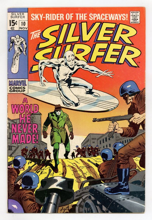 Starts Mar 23 "A World he Never Made!" Part 1 of 2. Written by Stan Lee. Art by John Buscema and Dan Adkins. In an effort to better understand mankind, the Silver Surfer ventures among them, incognito. Cover price $0.15. Grade: VG+ 4.5 explanation of grade Condition: Used (collectible)