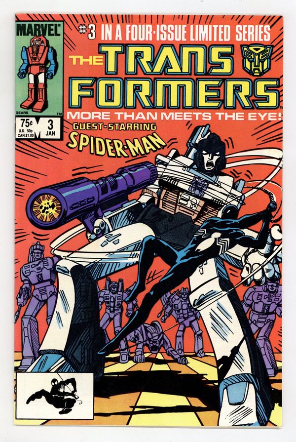 Starts Mar 23 First Printing. Direct Edition. "Prisoner of War!" Part 3 of 4. Guest-starring the Amazing Spider-Man. Nick Fury cameo. Story by Jim Salicrup. Art by Frank Springer, Kim DeMulder and Mike Esposito. Cover by Mark Texeira. The Decepticons have taken control of a nuclear power plant. Now, with the world watching, the Autobots must stop their malevolent counterparts before it's too late. At least they'll get a little help from everyone's favorite Friendly Neighborhood Spider-Man. This is a first printing. All 2nd or 3rd printings have a 2nd, 3rd printing notice on inside at bottom of indicia on first/splash page. 2nd printings were done for most issues from #1 to #9. Cover price $0.75. Grade: VF 8.0 explanation of grade Condition: Used (collectible)