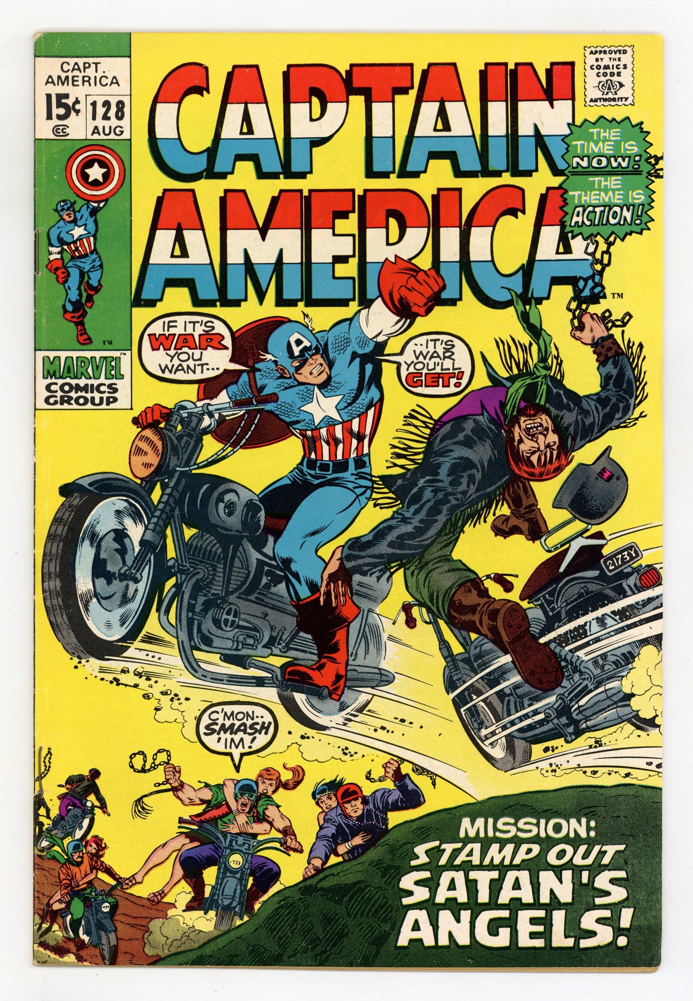 Starts Mar 23 Cover pencils by Marie Severin, inks by Joe Sinnott. "Mission: Stamp Out Satan's Angels," script by Stan Lee, pencils by Gene Colan, inks by Dick Ayers; Dismayed by hearing comments from the people that Captain America is washed up, Steve Rogers buys a motorcycle for driving across the country; Entering Coits Neck, he gets arrested by a policeman who thinks hes a member of Satans Angels; The Angels break Steve out of jail; Steve refuses to go with them and then rents a room in town; Later, the Angels terrorize an outdoor music festival by racing their motorcycles through the audience; Cap arrives on his bike to stop the destruction; Gang member Whitey tries to run down Cap with his bike; Cap fends him off with his shield; Red Skull watches this conflict on a view screen. Cameos by the Red Skull, Bucky Barnes, Baron Zemo, Clark Gable, and W.C. Fields. 36 pgs., full color. $0.15. Cover price $0.15. Grade: VG+ 4.5 explanation of grade Condition: Used (collectible)