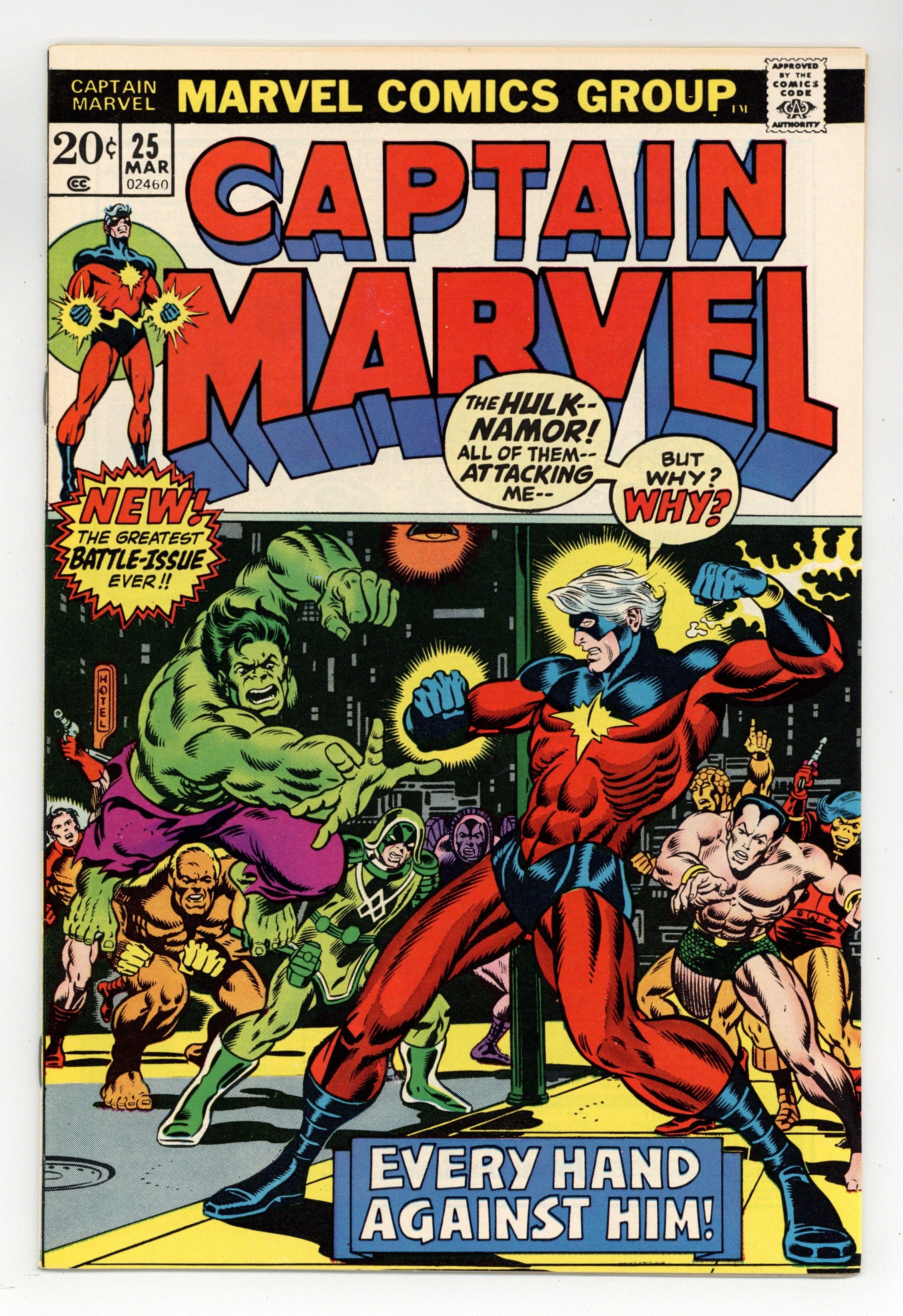 Starts Mar 23 Cover pencils by Jim Starlin, inks by Joe Sinnott. Captain Marvel battles the Super-Skrull (in the guise of Ronan, Megaton, Yon-Rogg, the Hulk, and the Sub-Mariner) in "A Taste of Madness!", script by Mike Friedrich, pencils by Jim Starlin (first work on the series), inks by Chic Stone; In an elaborate scheme of the Skrulls and their mysterious Masterlord, Super-Skrull and Kl'rt, Rick Jones is framed for the murder of Dr. Benjamin Savannah and brought to a run-down police precinct; Using Super-Skrulls invisibility as well as other Skrull technology, Mar-Vell and Rick are led to believe that many of his long-time friends and foes have returned and are attacking him; Rick and Mar-Vell identify the ruse, and Mar-Vell attacks the Skrulls; The building collapses in the battle and the Skrulls escape. 36 pgs., full color. Cover price $0.20. Grade: VF- 7.5 explanation of grade Condition: Used (collectible)