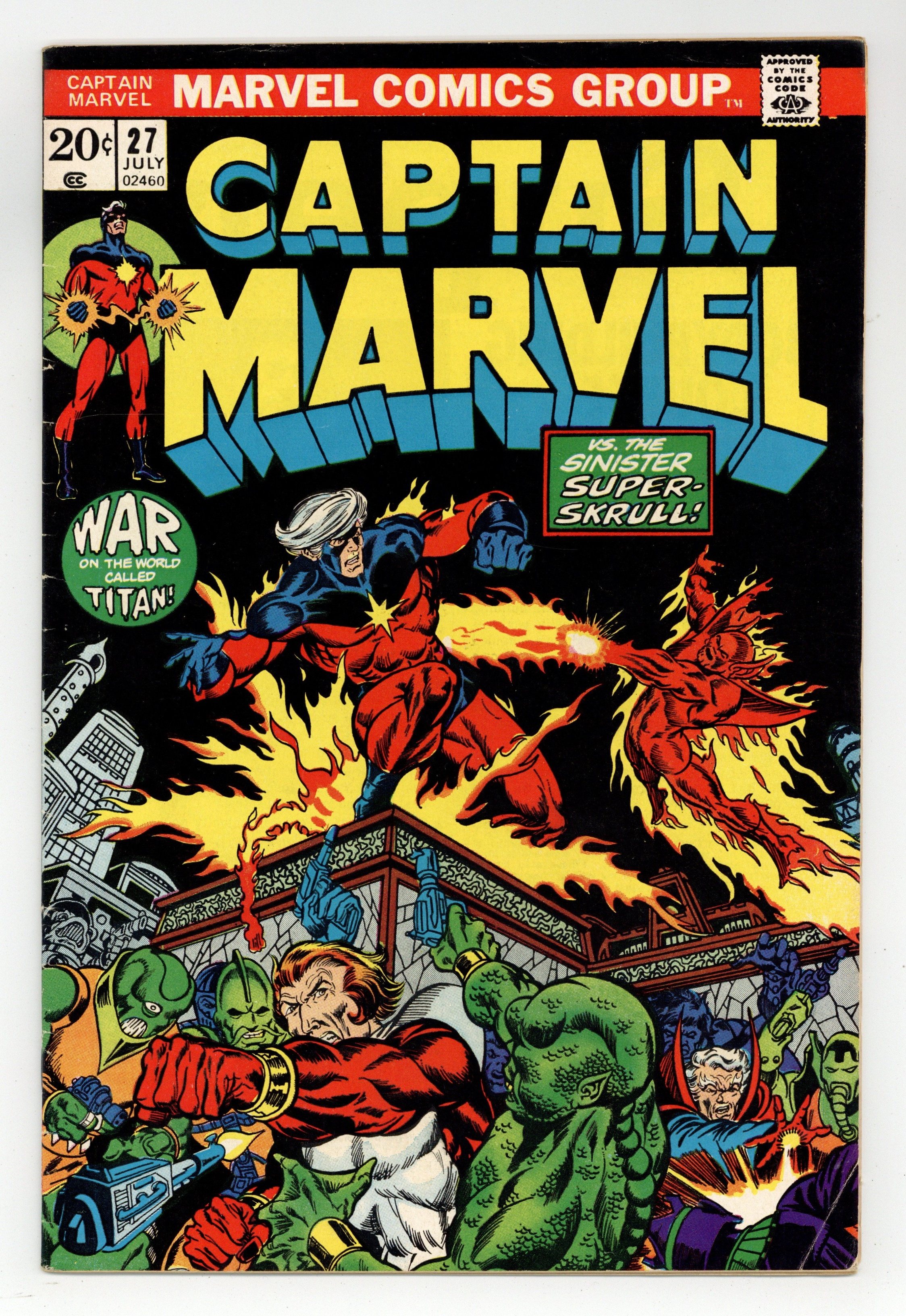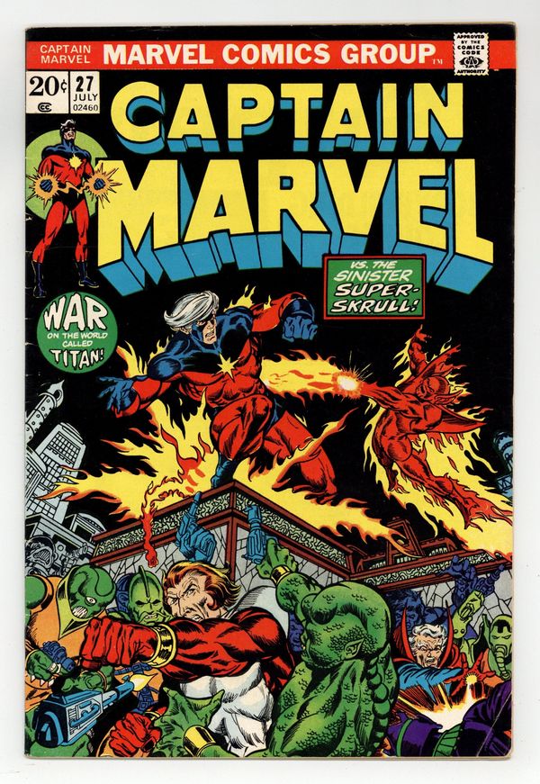 Starts Mar 23 The Super-Skrull continues to pester Captain Marvel in "Trapped on Titan!" Script by Mike Friedrich, plot and pencils by Jim Starlin, inks by Pablo Marcos. Meanwhile, Thanos seeks out the Cosmic Cube. Cameos by the Thing (of the Fantastic Four), the Avengers (Captain America, Iron Man, the Scarlet Witch, the Vision, and the Black Panther), and Drax the Destroyer. This issue also contains a map of Titan. Cover price $0.20. Grade: GD/VG 3.0 explanation of grade Condition: Used (collectible)