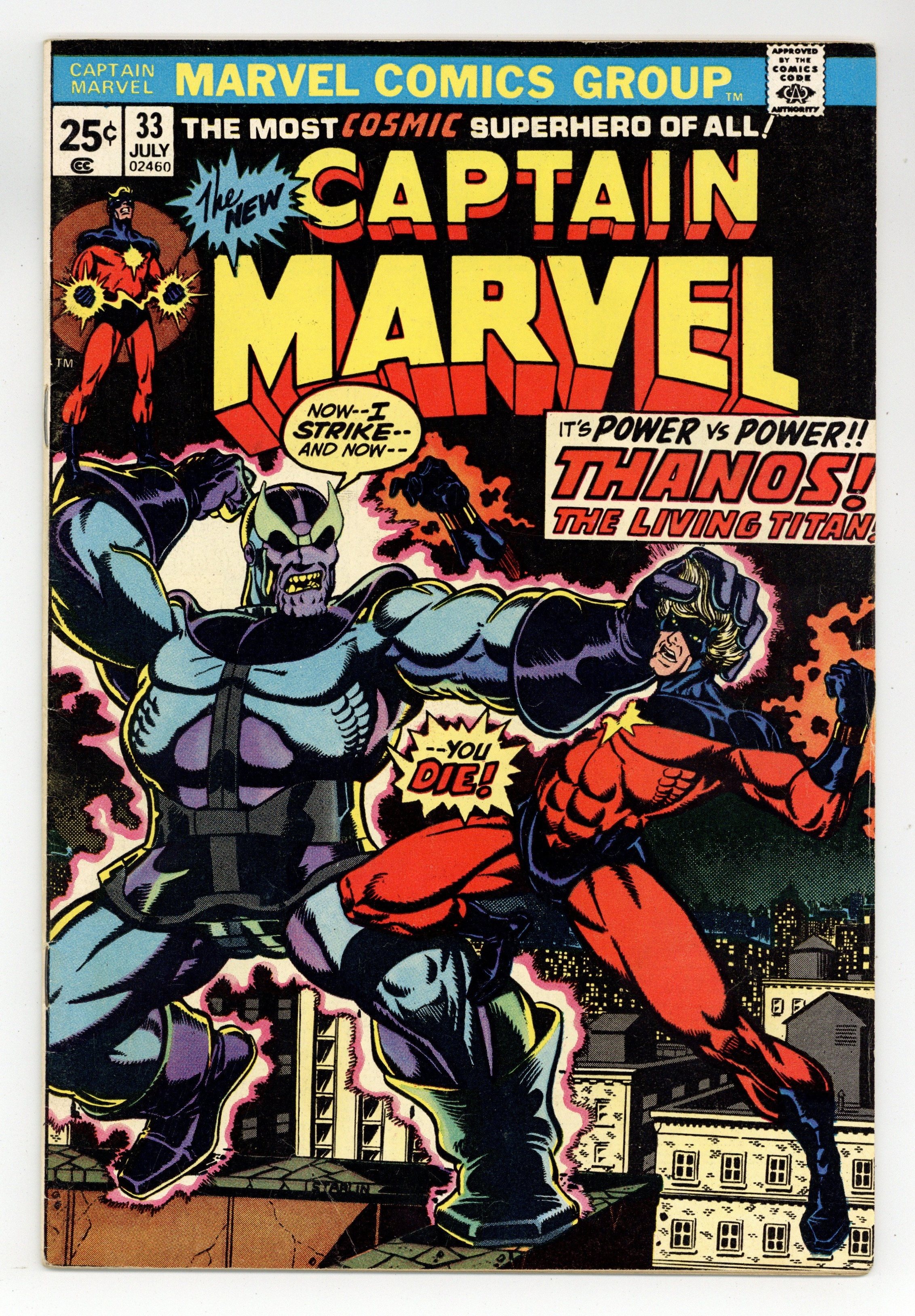 Starts Mar 23 Captain Marvel battles Thanos in "The God Himself!" Script by Steve Englehart, plot and pencils by Jim Starlin, inks by Klaus Janson. Guest starring Drax the Destroyer. Brief appearance by the Avengers (Thor, Iron Man, the Vision, the Swordsman, Captain America, the Black Panther, and the Scarlet Witch). The letters page contains Marvel Value Stamp series A # 6 (Thor by John Buscema). Starlin cover. Cover price $0.25. Grade: VG+ 4.5 explanation of grade Condition: Used (collectible)