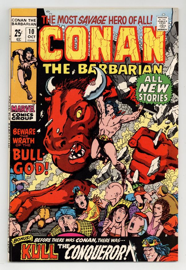 Starts Mar 23 Giant-size issue. Cover art by Barry Windsor-Smith and Marie Severin (Kull vignette). Giant-size issue. Beware the Wrath of Anu! Script by Roy Thomas, pencils by Barry Windsor-Smith, inks by Sal Buscema; setting: Corinthian city; Conan teams with Burgun in thievery. Burgun is betrayed & hung; Conan avenges his death by killing Aron & a priest; Jenna leaves Conan for Igon; Red Bull is freed and becomes the stars. 5-page King Kull back-up, The King and the Oak, adapting the poem by Robert E. Howard; breakdowns by Roy Thomas, pencils by Marie Severin, inks by John Severin. Reprint: Men of the Shadows! Script by Stan Lee, art by Joe Maneely (from The Black Knight 5, April 1956). Letter to the editor from Gerald W. Page (editor of Witchcraft and Sorcery Magazine). 52 pgs. Cover price: $0.25. Cover price $0.25. Grade: VF- 7.5 explanation of grade Condition: Used (collectible)