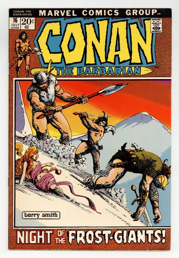 Starts Mar 23 Cover art by Barry Windsor-Smith. The Frost Giant's Daughter, script by Roy Thomas, art by Barry Windsor-Smith; setting: Snowy battlefield; Conan chases Atali across the snow, slays her two frost giant brothers, and catches her; Her father, Ymir then takes her from Conan. This story originally appeared in Savage Tales 1, but for its publication here Windsor-Smith added another page (a new splash page), and some panels and dialogue were altered for Comics Code approval. Back-up reprint story: The Sword and the Sorcerers (from Chamber of Darkness 4), script by Roy Thomas, art by Windsor-Smith. Also in this issue: a full-page reprint of the Hyborian Age map from Conan 1. 36 pgs. Cover price $0.20. Cover price $0.20. Grade: FN/VF 7.0 explanation of grade Condition: Used (collectible)