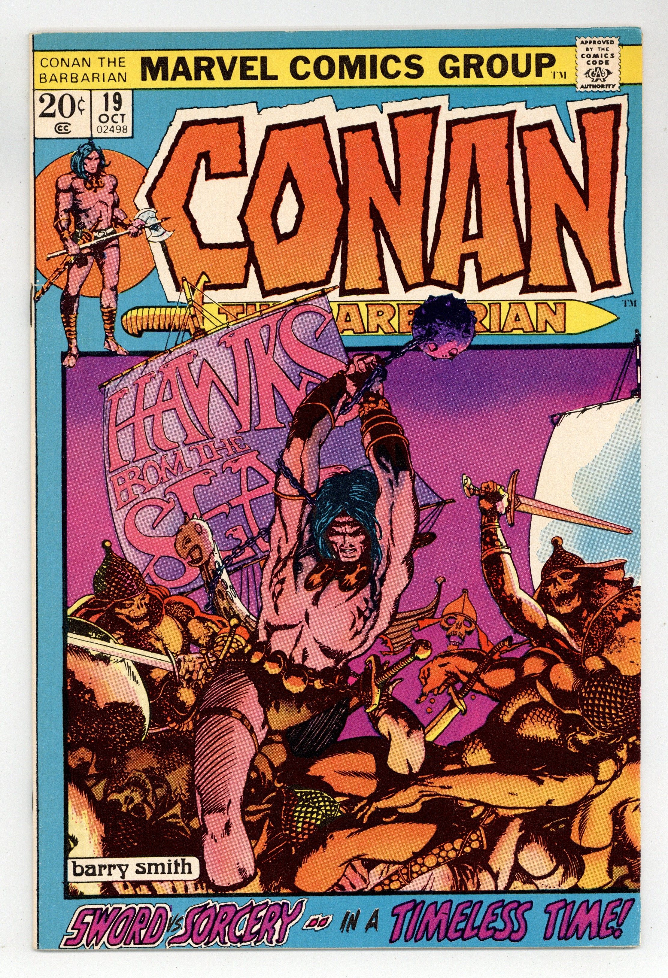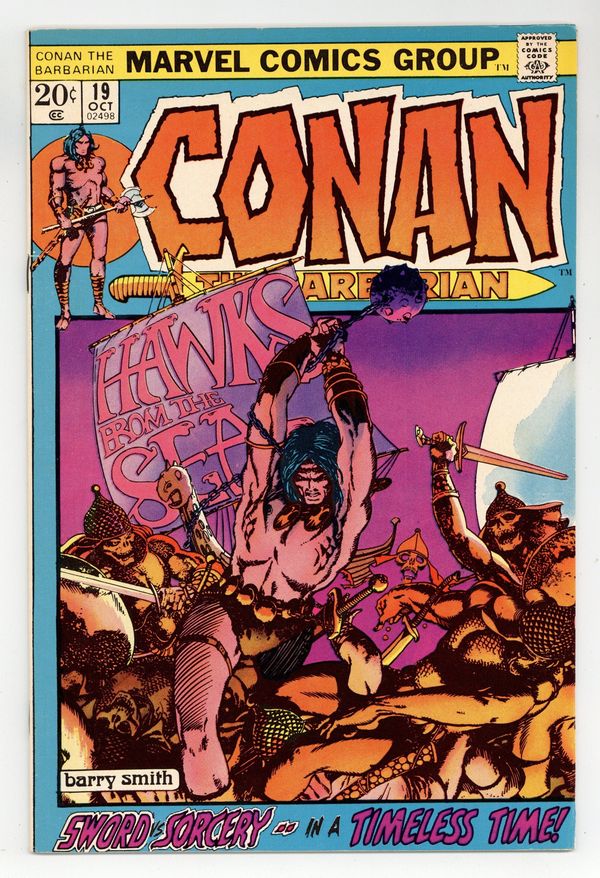 Starts Mar 23 Cover art by Barry Windsor-Smith. Hawks From the Sea, script by Roy Thomas, pencils by Barry Windsor-Smith, inks (pages 1-9) by Dan Adkins. (Pages 10-20 were reproduced directly from the pencils); setting: Ship, City of Makkalet; Conan works for Turanian military and lays seige to Makkalet; Legend of the Living Tarim is told; Conan makes enemy of Balthaz; Fafnir is wounded by flaming arrow. 36 pgs. Cover price $0.20. Cover price $0.20. Grade: FN/VF 7.0 explanation of grade Condition: Used (collectible)