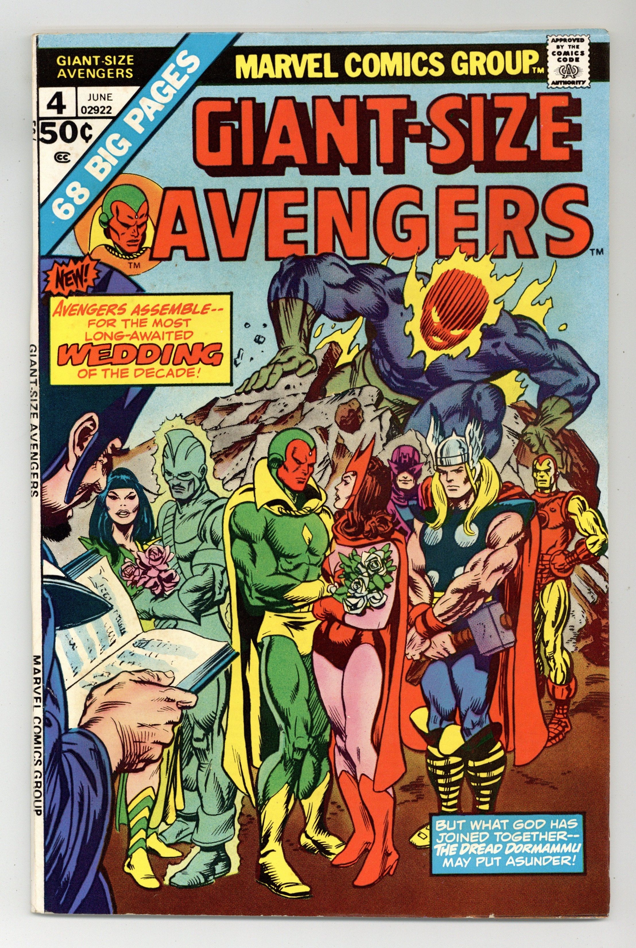 Starts Mar 23 "Let All Men Bring Together!" Wedding of the Vision and Scarlet Witch. Story by Steve Englehart. Pencils by Don Heck. Inks by John Tartaglione. Cover by Gil Kane, Al Milgrom, and John Romita (touch-ups). Story continues from Avengers 135. The Vision's quest through time to discover his origin is over. But instead of returning to Immortus' domain, the synthezoid avenger materializes at the center of the Earth! And shockingly the Dread Dormammu is there! With his captive…the Scarlet Witch! Wow, how did Wanda end up in the dreaded one's clutches? It doesn't matter now as the Vision must fight for the woman he loves! It's a supernatural showdown at Earth's core: The Vision, Scarlet Witch, and Agatha Harkness vs. the Dread Dormammu and Umar! Meanwhile in Vietnam, while the Cotati explains the mystery of the Celestial Madonna to Mantis and Moondragon; Hawkeye, Shell-Head, and the thunder god slip outside the temple and bump into the Titanic Three! However the three communist super-villains have been beaten badly! Who did this? Who else…but the Conqueror! And one more time, one final time, the assembled Avengers battle Kang…for the Celestial Madonna! An extraordinary ending for Earth's Mightiest Heroes! Cameo appearances by the Space Phantom, Crimson Dynamo, Radioactive Man, Titanium Man, and Gaea. Flashback cameos by the Swordsman, original Human Torch, and Ultron. Avengers Lineup: Hawkeye, Iron Man, Mantis, Scarlet Witch, Thor, and the Vision. First reprint story: "Betrayed by the Ants!" Plot by Stan Lee. Script by Larry Lieber. Pencils by Jack Kirby. Inks by Dick Ayers. The Ant-Man battles Egghead. Originally published in Tales to Astonish 38. Second reprint story: "Then Came…the Black Widow" Script by Gary Friedrich. Pencils by John Buscema. Inks by John Verpoorten. Originally published in Amazing Adventures 1 (2nd series). (Notes: This issue marks the end of the Celestial Madonna saga. Truly a bronze age masterpiece. Kang appears next in Avengers 141. Mantis does not return until many years later in Silver Surfer (2nd series) 3 & 4. The Vision and the Scarlet Witch first met in Avengers 76. Elements of this story overlap with Doctor Strange (1st series) 8. This issue was reprinted in 2005 in the trade paperback: Avengers…Vision and the Scarlet Witch. The letters page includes letters from comics publisher Dean Mullaney and comics artist Bill Blyberg, respectively.) 64 pages Cover price $0.50. Grade: FN- 5.5 explanation of grade Condition: Used (collectible)