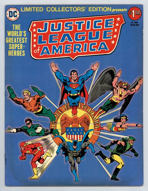 Starts Mar 23 Limited Collectors' Edition: Justice League of America reprints. Decoy Missions of the Justice League, script by Gardner Fox, art by Mike Sekowsky and Bernard Sachs; Kanjar Ro, the villain from the planet Dhor, conceives a brilliant scheme to steal the entire Earth—without the Justice League even knowing it; guest-starring Adam Strange. The Deadly Dreams of Dr. Destiny, script by Gardner Fox, art by Mike Sekowsky and Bernard Sachs. Two-page JLA pinup by Austin and Giordano. The JLA on TV featuring Alex Toth Super Friends art. Treasury-sized. 52 pgs. Size is 10 x 13-1/2" (about the size of a Life magazine). Cover price $1.00. Cover price $1.00. Grade: FN 6.0 explanation of grade Condition: Used (collectible)