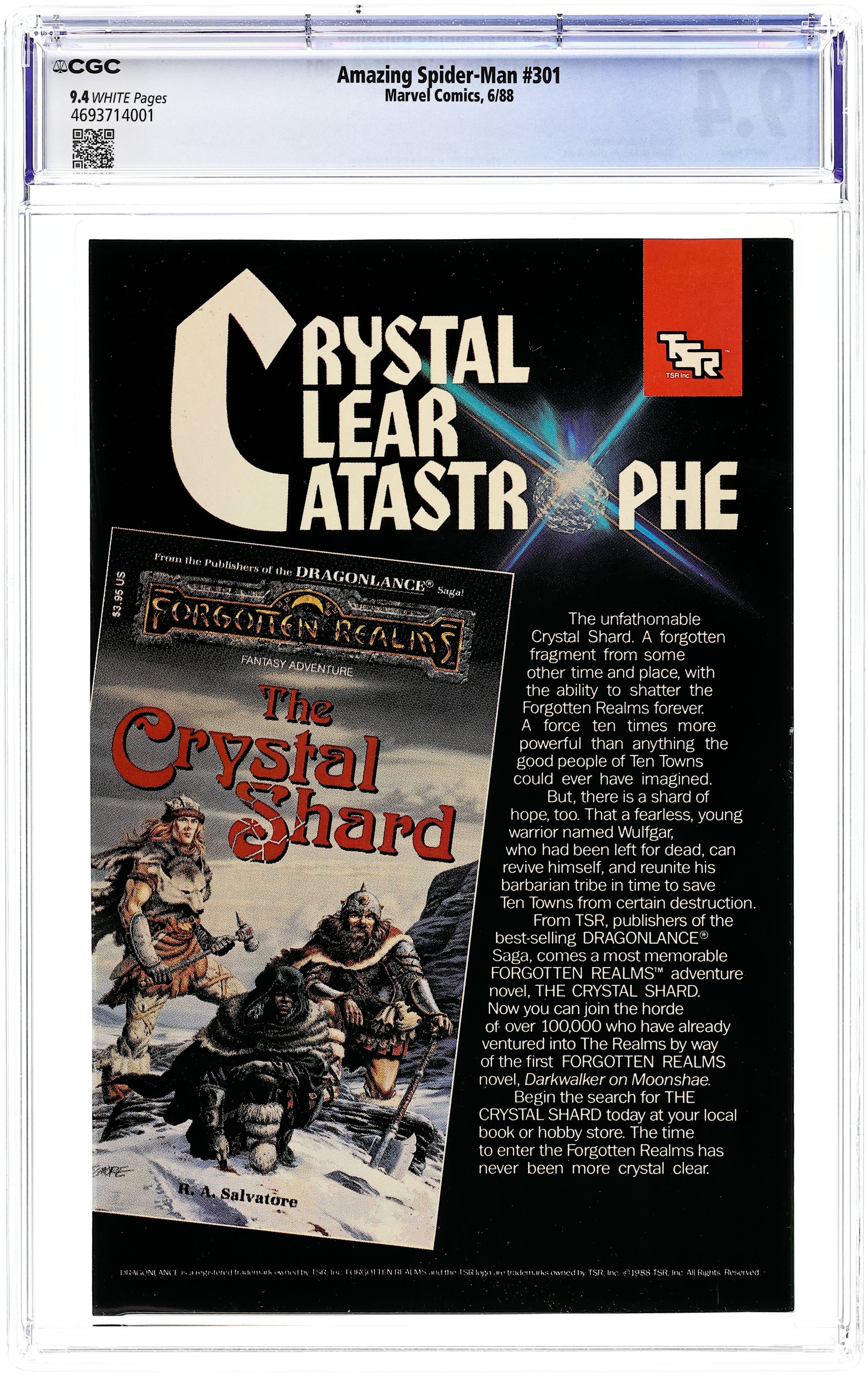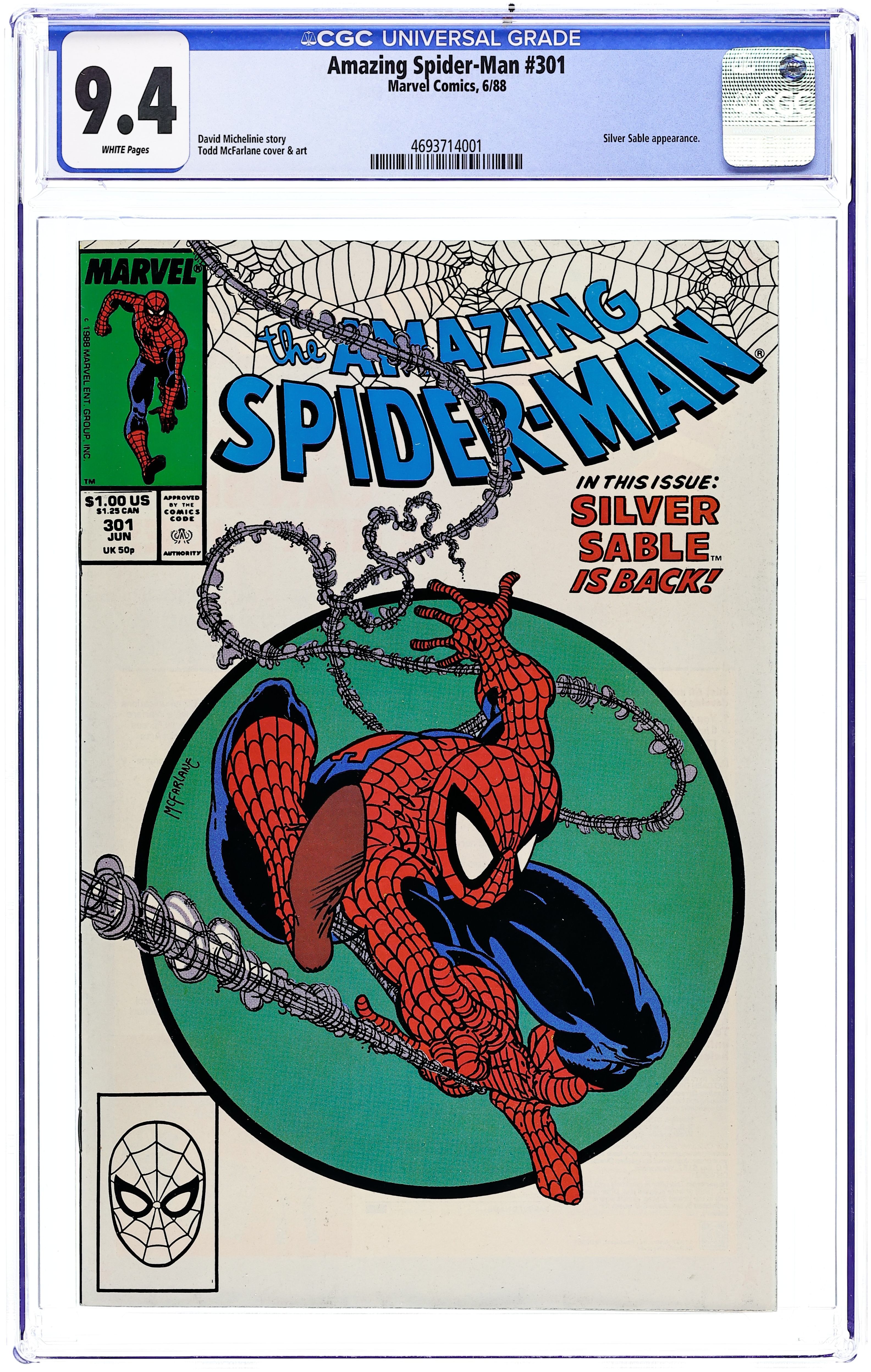Direct Edition. "The Sable Gauntlet!" Guest-starring Silver Sable. Script by David Michelinie. Art by Todd McFarlane. Cover by Todd McFarlane. The first 300 issues of the Amazing Spider-Man are in the books after the web-slinger's epic battle vs. Venom last issue! And now the next chapter in the wall-crawler's anthology begins with an encounter with his favorite mercenary: Silver Sable! The enchanting sable agrees to make a test run through the security systems of a new high-rise office building, but deadly danger awaits on the top floor! Will Spidey catch the elevator in time? Cameo appearances by Mary Jane Watson and Dr. Morris Sloan. First $1.00 issue. (Notes: The cover is the same artwork (with different colors) as the cover to issue 300. This issue includes a full-page ad for the first appearance of Typhoid Mary in the Daredevil (1st) series -- art by John Romita Jr. and Al Williamson. The letters page contains a statement of ownership: average print run 469,913; average paid circulation 284,692. 36 pgs. Cover price $1.00. Grade: CGC 9.4 explanation of grade Condition: Used (collectible)