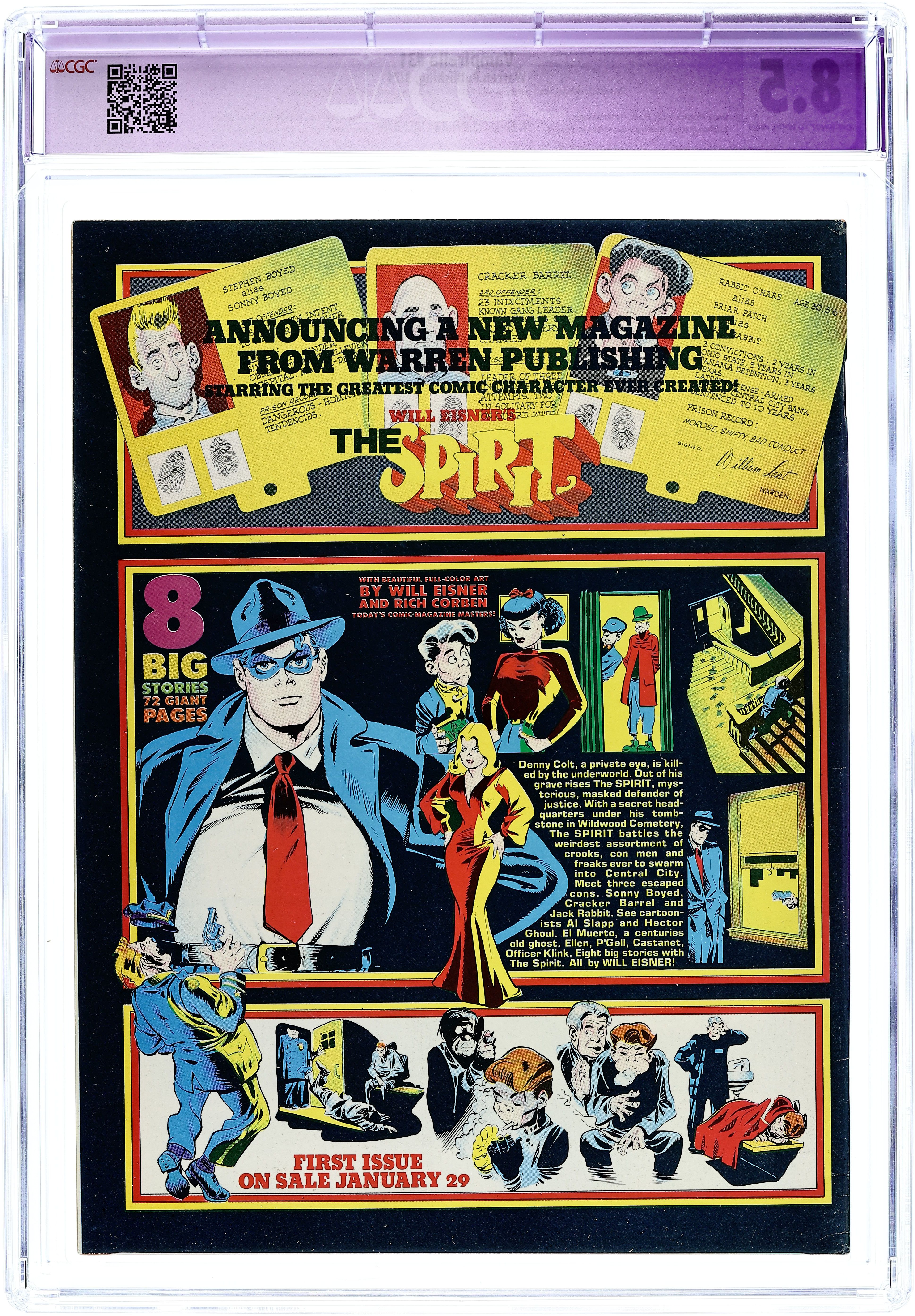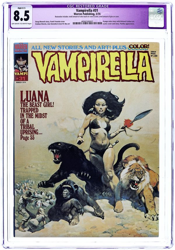 Starts Apr 4 Stories in this issue include: "Betrothed of the Sun-God" (starring Vampirella); "Pantha: Family Ties" (a she-panther tale); "The Truth"; "The Woodlik Inheritance" (in full color); "The Incurable Phobia"; and Luana (based on the feature film). Written by Jose Bea, Richard Corben, Fernando Fernandez, Flaxman Loew, Doug Moench, and Steve Skeates. Art by Auraleon, Jose Bea, Richard Corben, Fernando Fernandez, Jose Gonzalez, and Esteban Maroto. Includes ad for 8-inch Superman, Batman, Robin, and Aquaman figures from Captain Company. Includes ad for the new Spirit magazine from Warren. Cover art by Frank Frazetta. Cover price $1.00. Grade: CGC 8.5 explanation of grade Condition: Used (collectible)