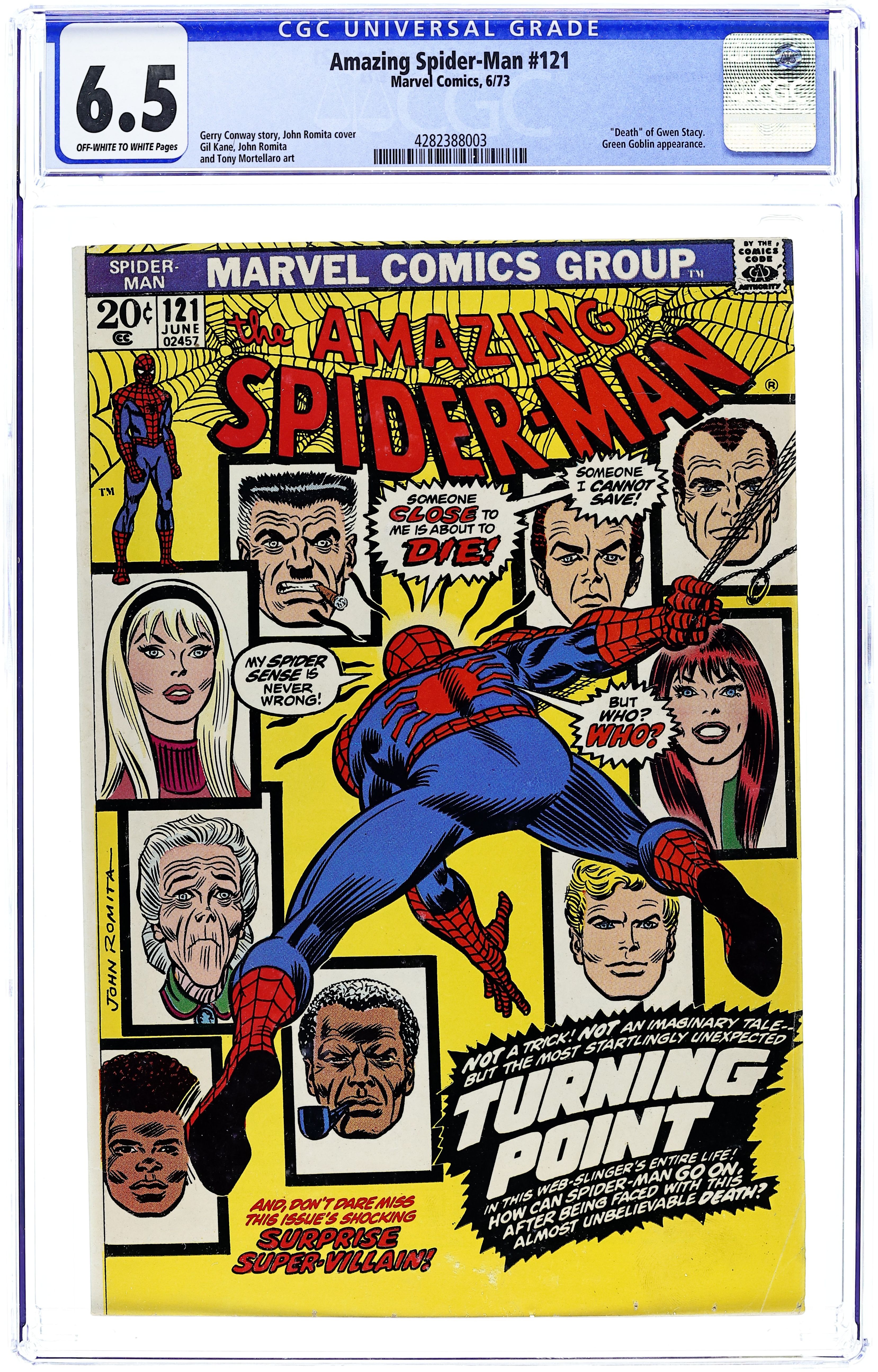 Starts Apr 4 Death of Gwen Stacy in "The Night Gwen Stacy Died" Part 1 of 2. Script by Gerry Conway. Pencils by Gil Kane. Inks by John Romita and Tony Mortellaro(backgrounds). Cover by John Romita. One of the greatest Spider-Man stories of all-time! Peter Parker returns from Canada to find his world on fire! His roommate Harry Osborn has overdosed again, and Norman Osborn is blaming Peter for his son's relapse. As the situation becomes more and more stressful, Norman recalls his super-villain past -- and the Green Goblin lives once more! However, this version of the goblin is more sick and twisted than previous ones. And to get revenge against the web-slinger, the goblin kidnaps Gwen and takes her to the top of the Brooklyn Bridge. Sothen and there, the Amazing Spider-Man and the Green Goblin fight for the life of Gwen Stacy. But sometimes the good guys don't win. A heartbreaking ending. Cameo appearances by Mary Jane Watson, J. Jonah Jameson, and Joe Robertson. (Notes: This two-part story was a watershed event in the history of Marvel Comics. This issue was reprinted in Marvel Tales #98 and again in issue 192.) 36 pages. Cover price $0.20. Grade: CGC 6.5 explanation of grade Condition: Used (collectible)