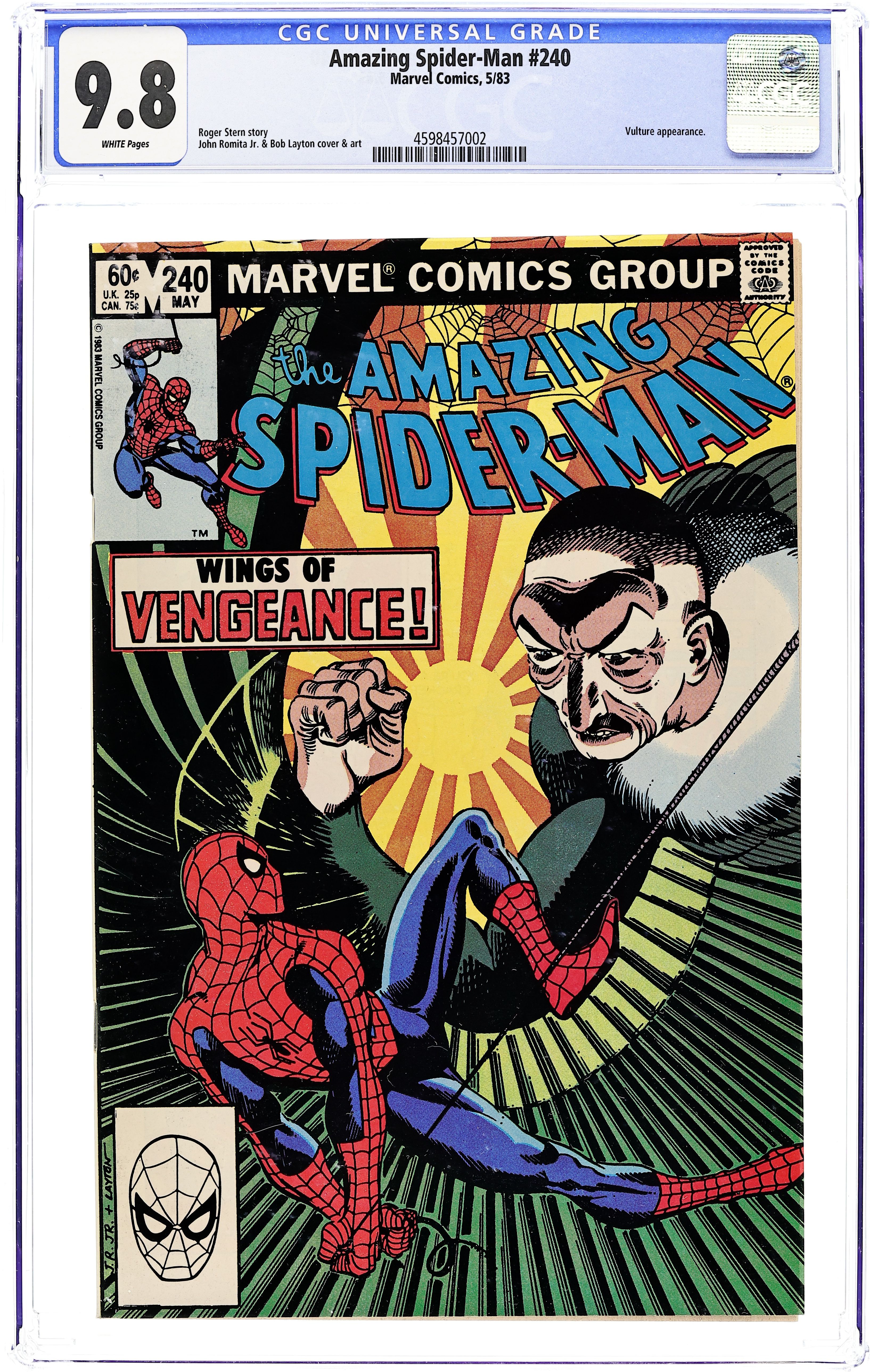 Starts Apr 4 Direct Edition. "Wings of Vengeance!" Part 1 of 2. Script by Roger Stern. Pencils by John Romita Jr. Inks by Bob Layton. Cover by John Romita Jr. and Bob Layton. The vindictive Vulture comes out of retirement to settle an old score! The elderly bird leaves his cushy Arizona nest and flies back to New York City! But returning to the Big Apple could bring the Vulture into conflict with his long-time wall-crawling foe! However the old super-villain doesn't care! He just wants revenge against his former business partner! Can the Vulture swoop into town and avoid a showdown with the web-slinger? Probably not! Cameo appearance by Aunt May. Flashback cameos by the Black Cat, Doctor Octopus, Gladiator, Hobgoblin, and the Owl. (Note: The letters page contains a statement of ownership: average print run 513,585; average paid circulation: 240,683.) 36 pages. Cover price $0.60. Grade: CGC 9.8 explanation of grade Condition: Used (collectible)