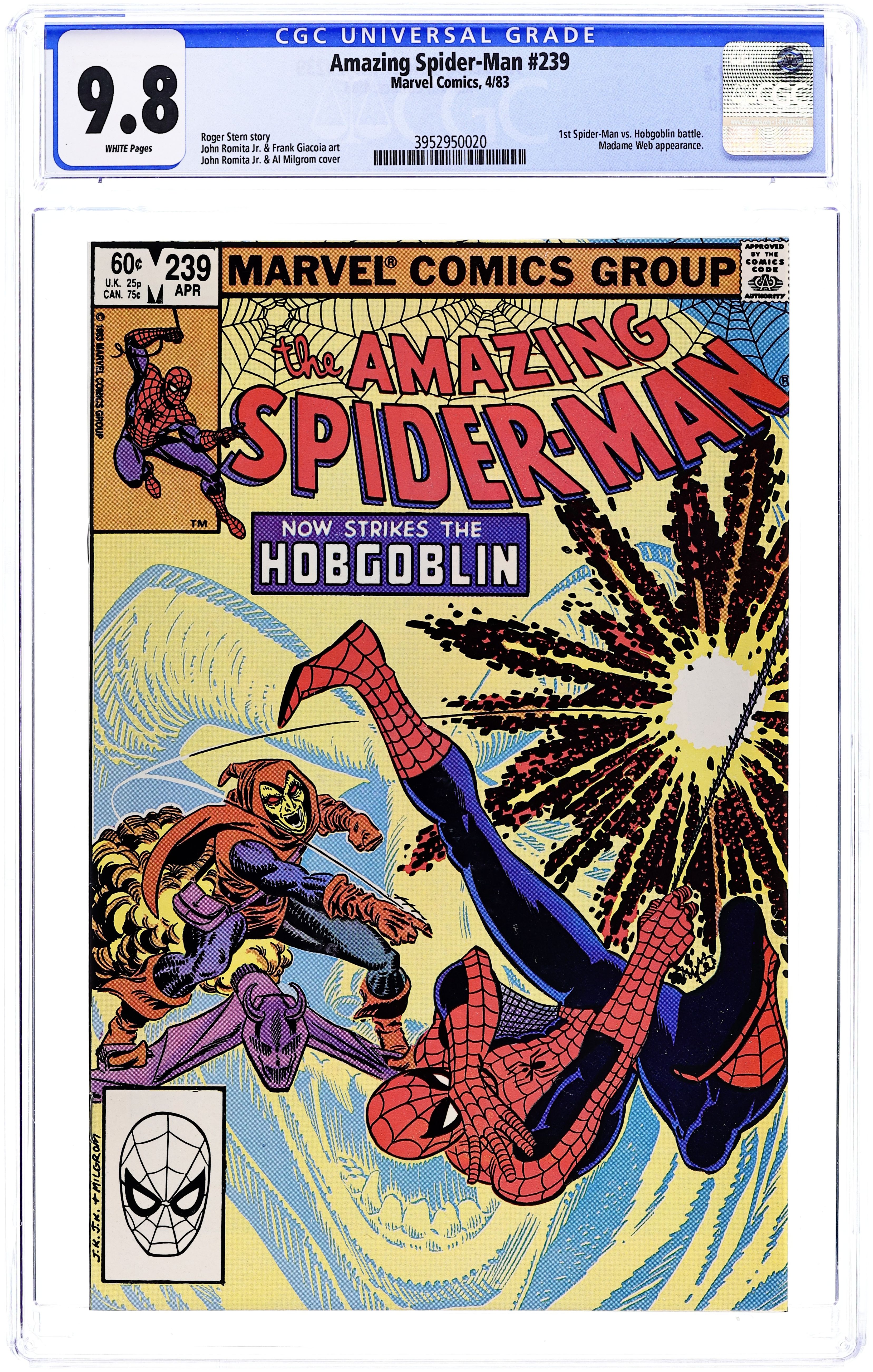 Starts Apr 4 Direct Edition. "Now Strikes the Hobgoblin!" Second appearance of the Hobgoblin. Script by Roger Stern. Art by John Romita Jr. (breakdowns) and Frank Giacoia (finishes). Cover by John Romita Jr. and Al Milgrom. It's the first fight between the Hobgoblin and the Amazing Spider-Man! And the all-out action begins after the web-slinger bumps into the new goblin at one of Norman Osborn's old hideouts! Spidey is very familiar with the goblin's bag of tricks! But the overmatched Hobgoblin doesn't have any idea about the wall-crawler's speed, strength, and agility! Is the Hobgoblin's criminal career going to be over before it even starts? An outstanding issue! Cameo appearances by Harry Osborn, Madame Web, Captain DeWolff, and the Black Cat. (Notes: The Hobgoblin returns in Amazing Spider-Man 244. This issue was reprinted in Marvel Tales 258.) 36 pages. Cover price $0.60. Grade: CGC 9.8 explanation of grade Condition: Used (collectible)