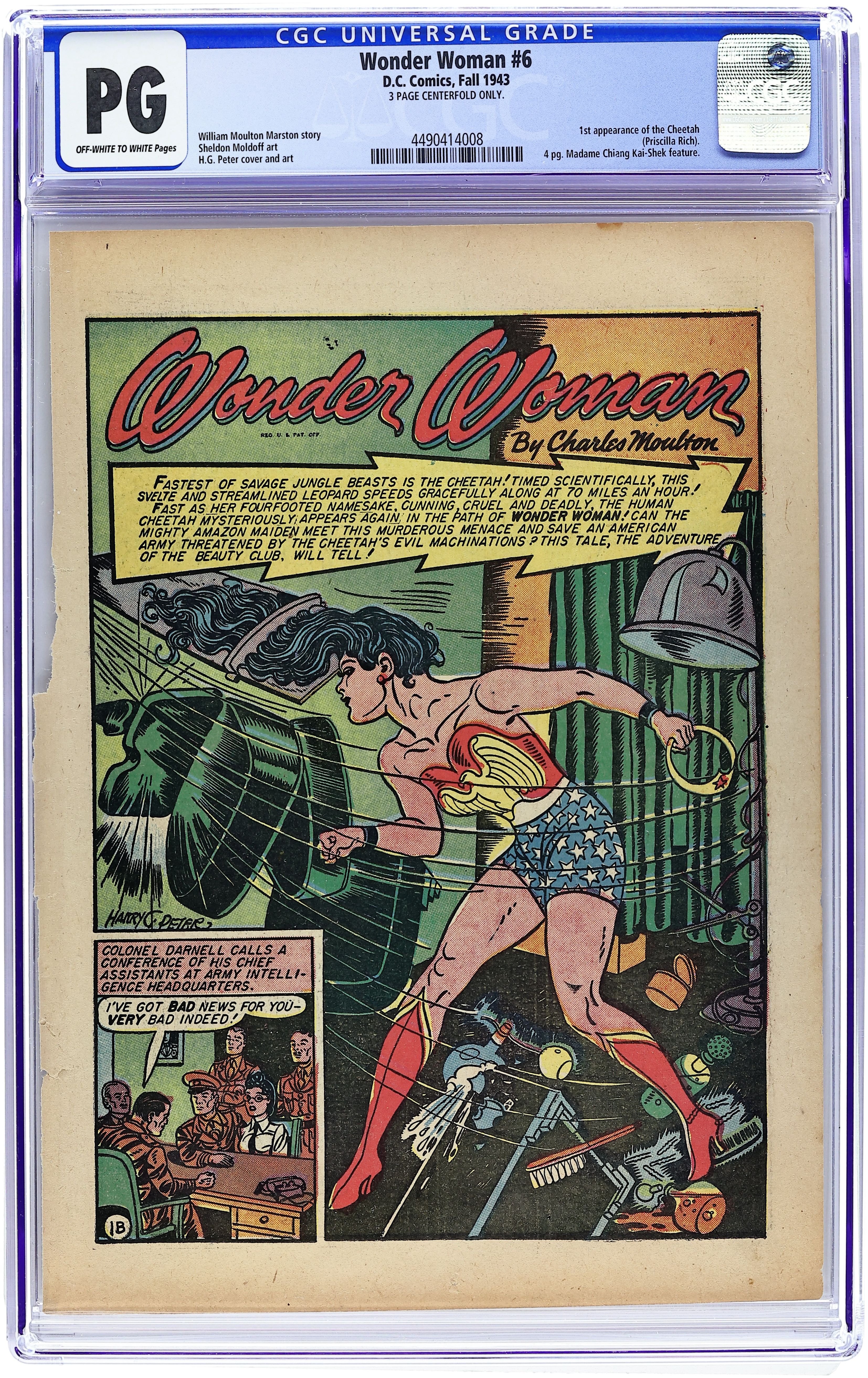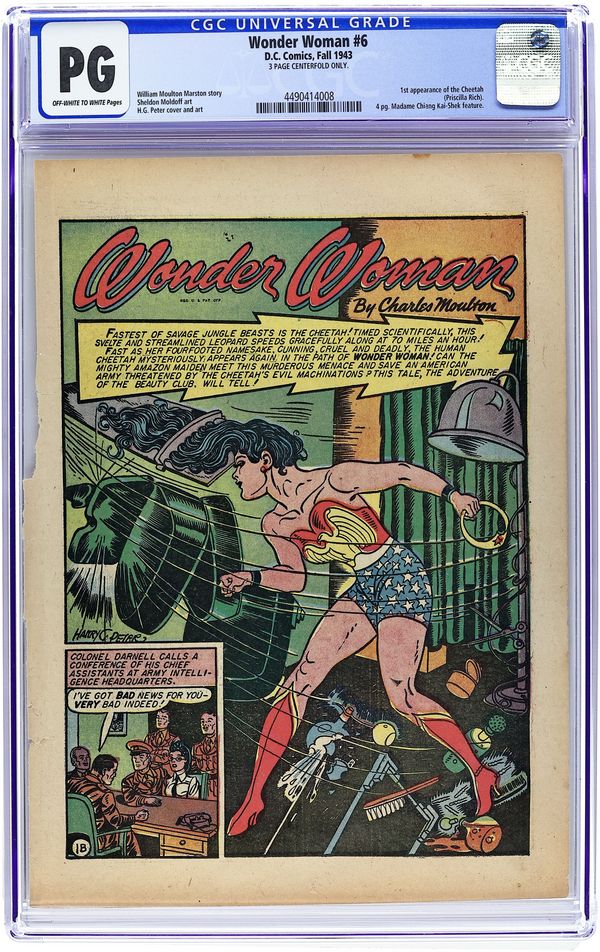 Cover by Harry G. Peter. 1st appearance of the Cheetah in "Wonder Woman and The Cheetah" script by William Moulton Marston (as Charles Moulton), art by Harry G. Peter; Upstaged by Wonder Woman at a charity event, a jealous socialite is overtaken by her evil alter ego, dons a Cheetah hide, and attempts to frame and kill her Amazon adversary. "The Adventure of the Beauty Club," script by William Moulton Marston (as Charles Moulton), art by Harry G. Peter; The Cheetah uses an exclusive beauty club as a front to learn military secrets from soldiers' families; Wonder Woman travels to the Pacific area to stop the Japanese from attacking an American base. "Hop Harrigan and the Radiosonde" text story. Women of History: four-page Madame Chiang Kai-Shek bio, script by Alice Marble, art by Sheldon Moldoff. "The Conquest of Paradise," script by William Moulton Marston (as Charles Moulton), art by Harry G. Peter; The Cheetah crashes a competition between Amazons and man's world girls on Paradise Island, seeking the source of the Amazons' strength to help her defeat Wonder Woman. 60 Pages, Full Color. Cover price $0.10. Grade: CGC 0.1 explanation of grade Condition: Used (collectible)