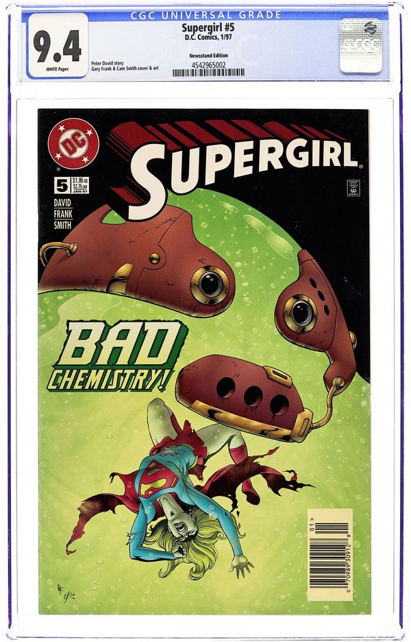 Starts Apr 20 Supergirl visits with Ma and Pa Kent in Kansas, while Chemo rampages across Leesburg in "Chemical Imbalance." Written by Peter David. Art & cover by Gary Frank & Cam Smith. Cover price $1.95. Grade: CGC 9.4 explanation of grade Condition: Used (collectible)