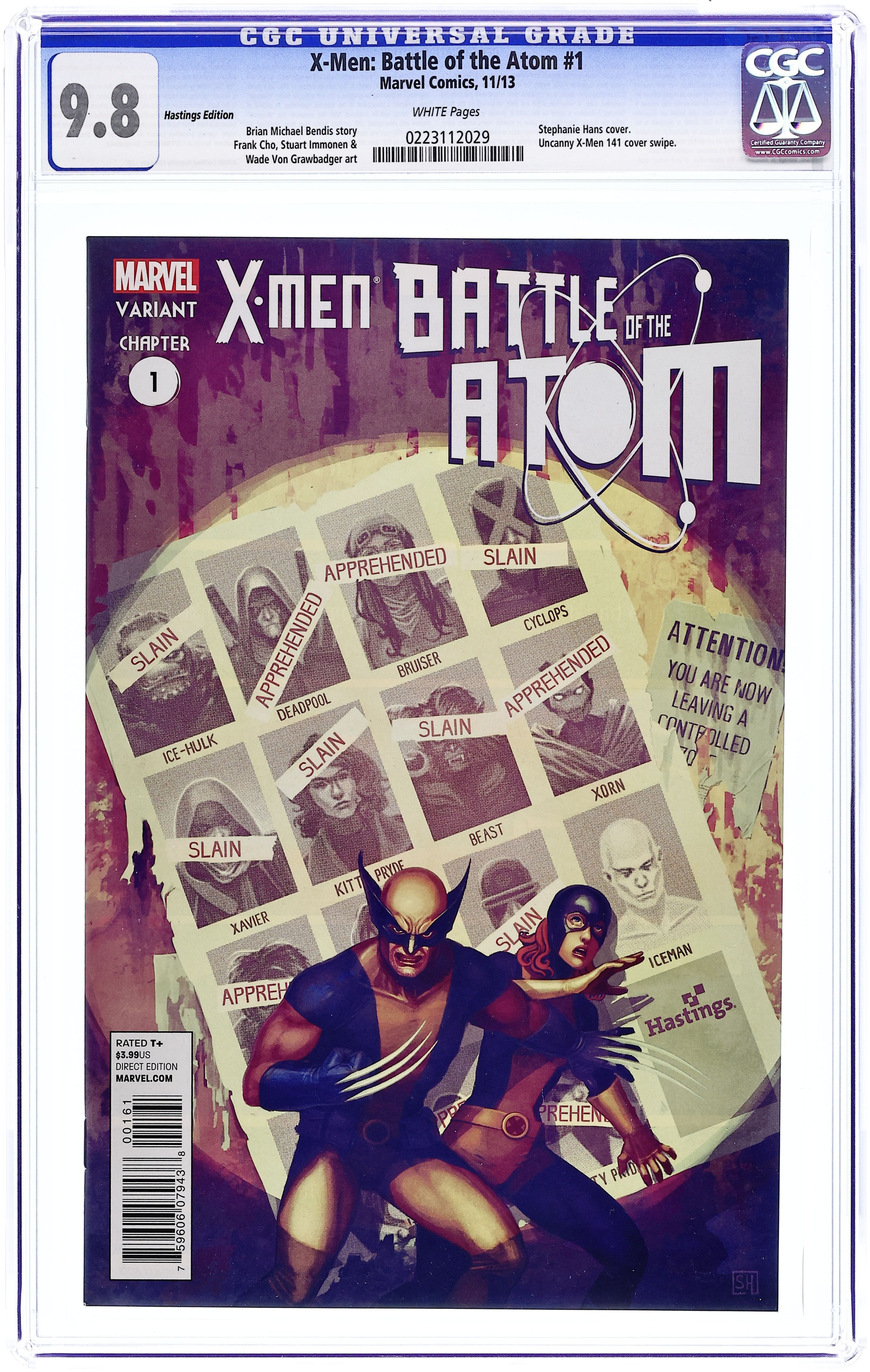 Starts Apr 4 Hastings Uncanny X-Men 141 Homage Variant. X-Men Battle of the Atom: Part 1 of 10 - (W) Brian Michael Bendis. (A) Frank Cho, Stuart Immonen, Wade von Grawbadger. (CA) Stephanie Hans. The past, present and future of the X-Men collide in this 50th Anniversary event crossover! When investigating a new mutant, something truly horrible happens to the All-New X-Men that shakes time and space to its core. This is so dire that X-Men come from THE FUTURE with a message: THE ALL-NEW X-MEN MUST RETURN TO THE PAST! The ten-part crossover starts here with superstars BRIAN MICHAEL BENDIS and FRANK CHO! Plus: pin-ups by David Lopez, Frazer Irving, Simone Bianchi, Phil Noto and Stefano Caselli. Cover price $3.99. Grade: CGC 9.8 explanation of grade Condition: Used (collectible)
