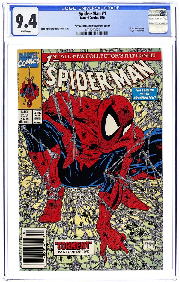 Starts Apr 20 Unbagged Newsstand Edition. Torment: Part 1 of 5. Story, art and cover by Todd McFarlane. Fresh off his legendary run on Amazing Spider-Man, super-star artist Todd McFarlane is given the reigns to his very own Spidey title. Right out of the gate the wall-crawler will be challenged like never before as mysterious and ominous drums in the distance are driving the savage Lizard to cut a swath of death and destruction through the streets of New York City. Can Spider-Man discover the one responsible for this madness before his arch foe causes more damage? NOTE: Webbing on cover may be grey or purple. Cover price $1.75. Grade: CGC 9.4 explanation of grade Condition: Used (collectible)