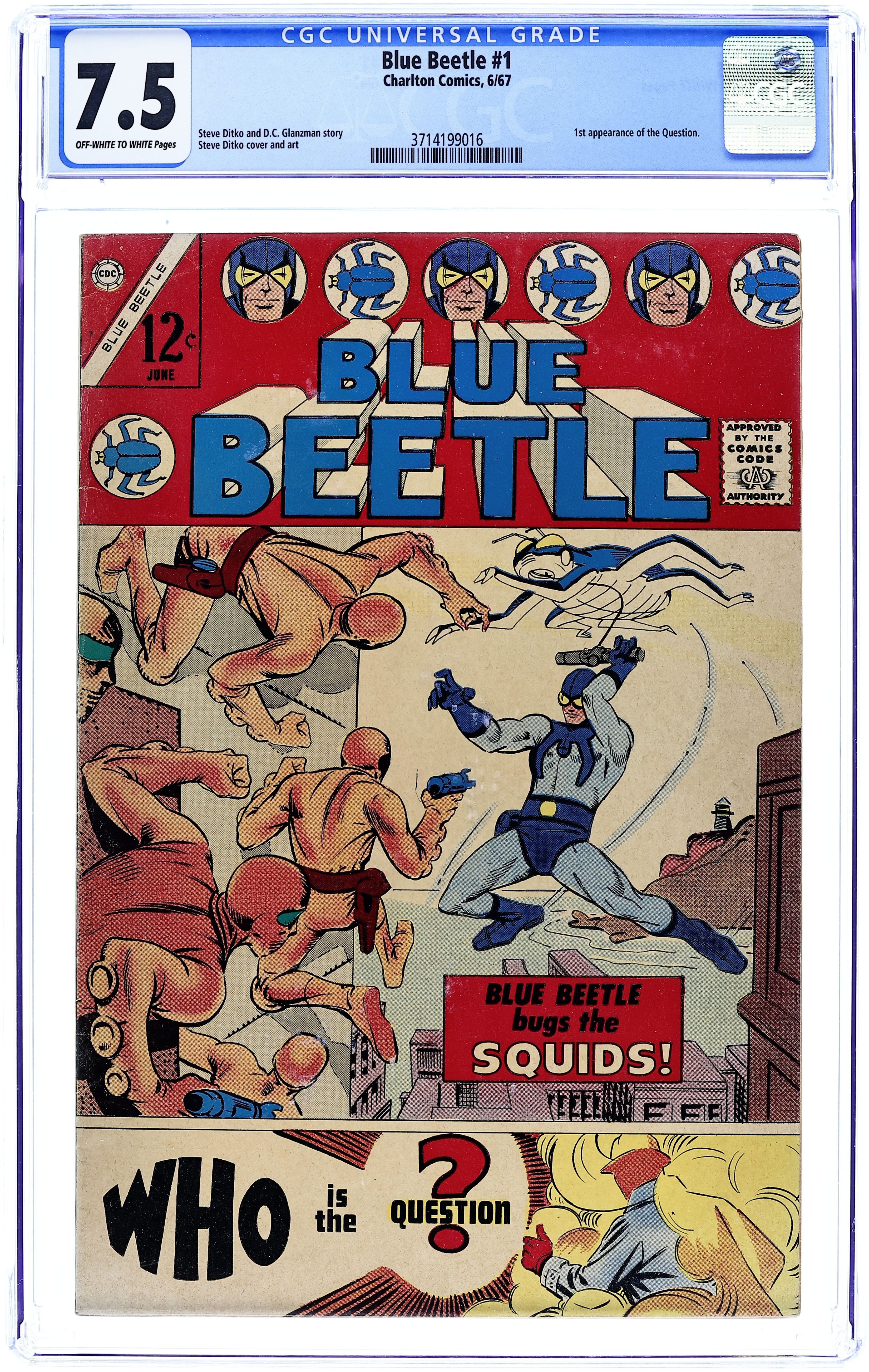 Cover by Steve Ditko. Stories and art by Steve Ditko, David Charles Glanzman and Dick Giordano. The third (or fourth, depending on how you count it) Charlton series to feature the Blue Beetle introduces the Silver Age BB, Ted Kord (after his debut as a backup character in Captain Atom). In one of the first superhero "reboots," Spider-Man co-creator Steve Ditko gives the Golden Age hero a new look, new tech, and a new alter ego, then sets him against the Squid Gang. The backup story introduces another classic Ditko hero: Vic Sage, the faceless crimefighter known as The Question. Blue Beetle Bugs the Squids; Who is the Question? 32 pages, Full Color. Cover price $0.12. Grade: CGC 7.5 explanation of grade Condition: Used (collectible)