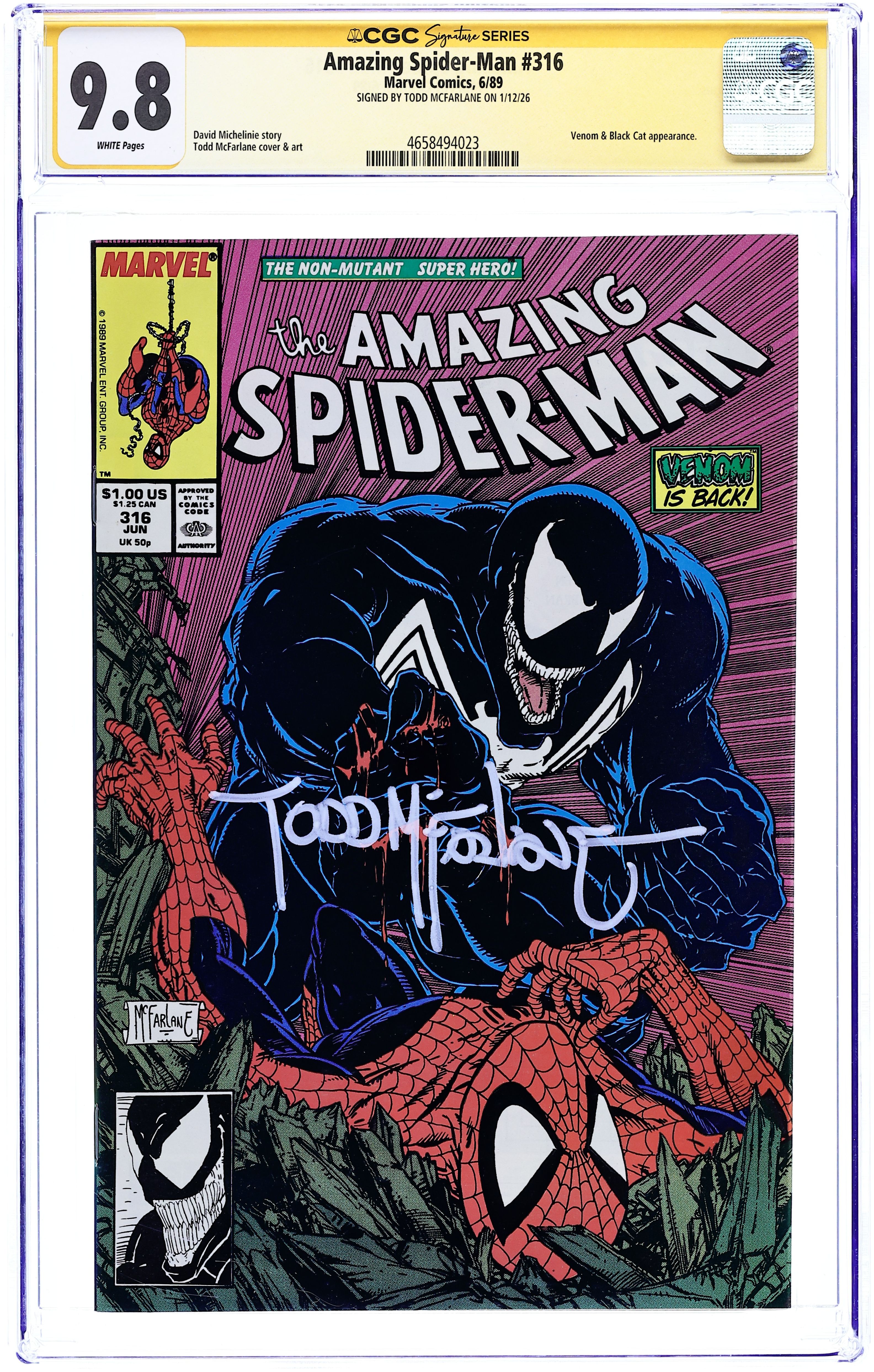 Direct Edition. "Dead Meat" Part 1 of 2. Script by David Michelinie. Art by Todd McFarlane. Cover by Todd McFarlane. Venom is back in New York City! And the deranged Eddie Brock is looking to kill Peter Parker or Spider-Man with extreme prejudice! However, first the psychotic symbiote has to find where the Parkers are living! At the web-slinger's former Bedford Towers residence, Venom runs into and then runs roughshod over the Black Cat! But Felicia doesn't know where the wall-crawler is either! Later on Peter learns that his worst nightmare has returned and his family is in grave danger. Spider-Man can't wait for Venom to make the first move. The web-slinger must attack! Cameo appearances by Aunt May, Glory Grant, and Eduardo Lobo. (Note: This two-part story was reprinted in 1990 in the trade paperback: Spider-Man vs. Venom.) 36 pages. Cover price $1.00. Grade: CGC 9.8 explanation of grade Condition: Used (collectible)