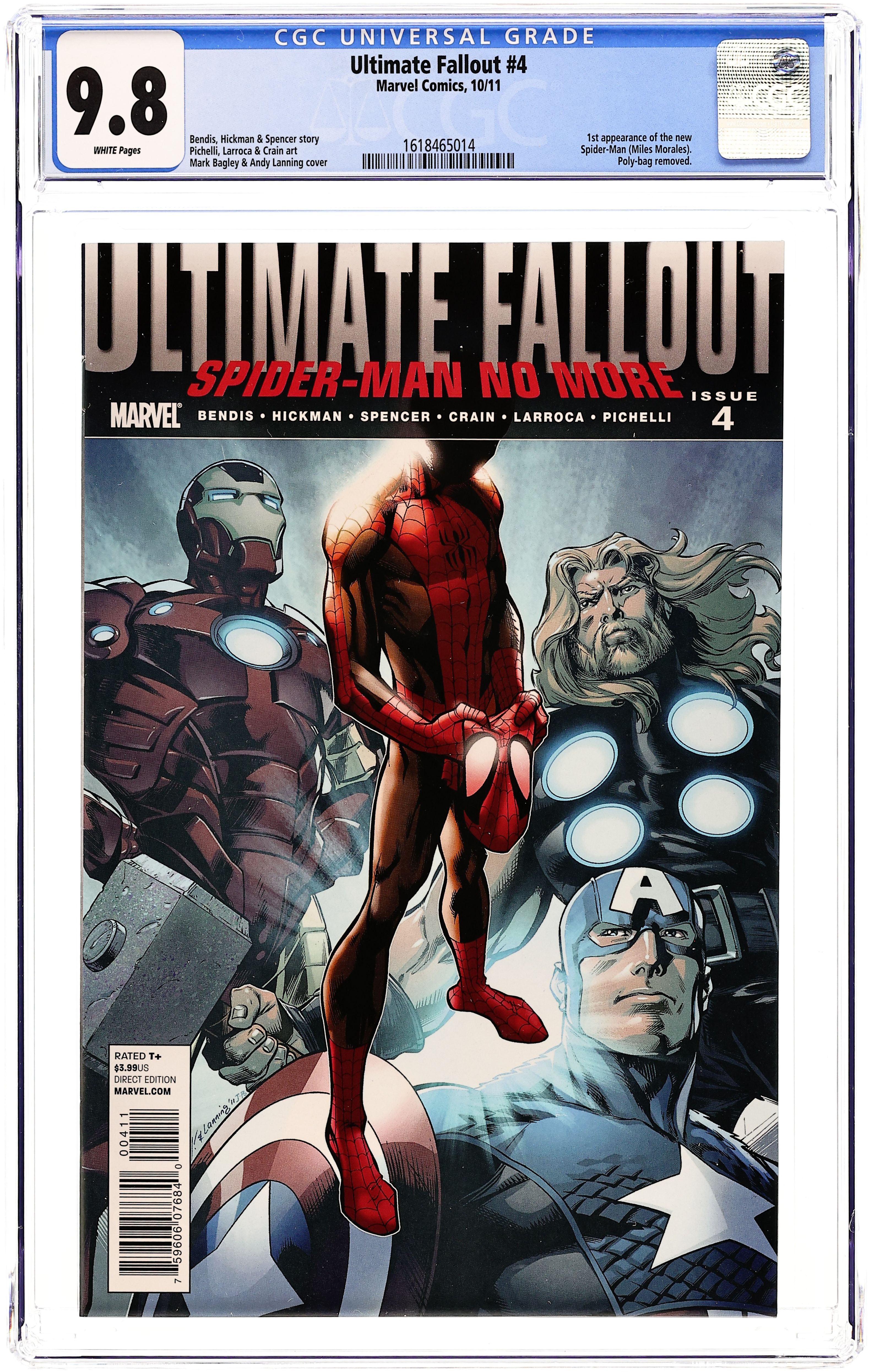 Direct Edition. 1st appearance of Miles Morales. Written by BRIAN BENDIS, JONATHAN HICKMAN & NICK SPENCER. Art by SARA PICHELLI, SALVADOR LARROCA & CLAYTON CRAIN. Cover by MARK BAGLEY. What will become of Captain America? Where have all the X-Men gone? And what is up with the new Spider-Man suit? Don't miss the final chapters of one of the most talked about Ultimate events ever. 36 PGS. (each)/Rated T+...$3.99 (each) Cover price $3.99. Grade: CGC 9.8 explanation of grade Condition: Used (collectible)