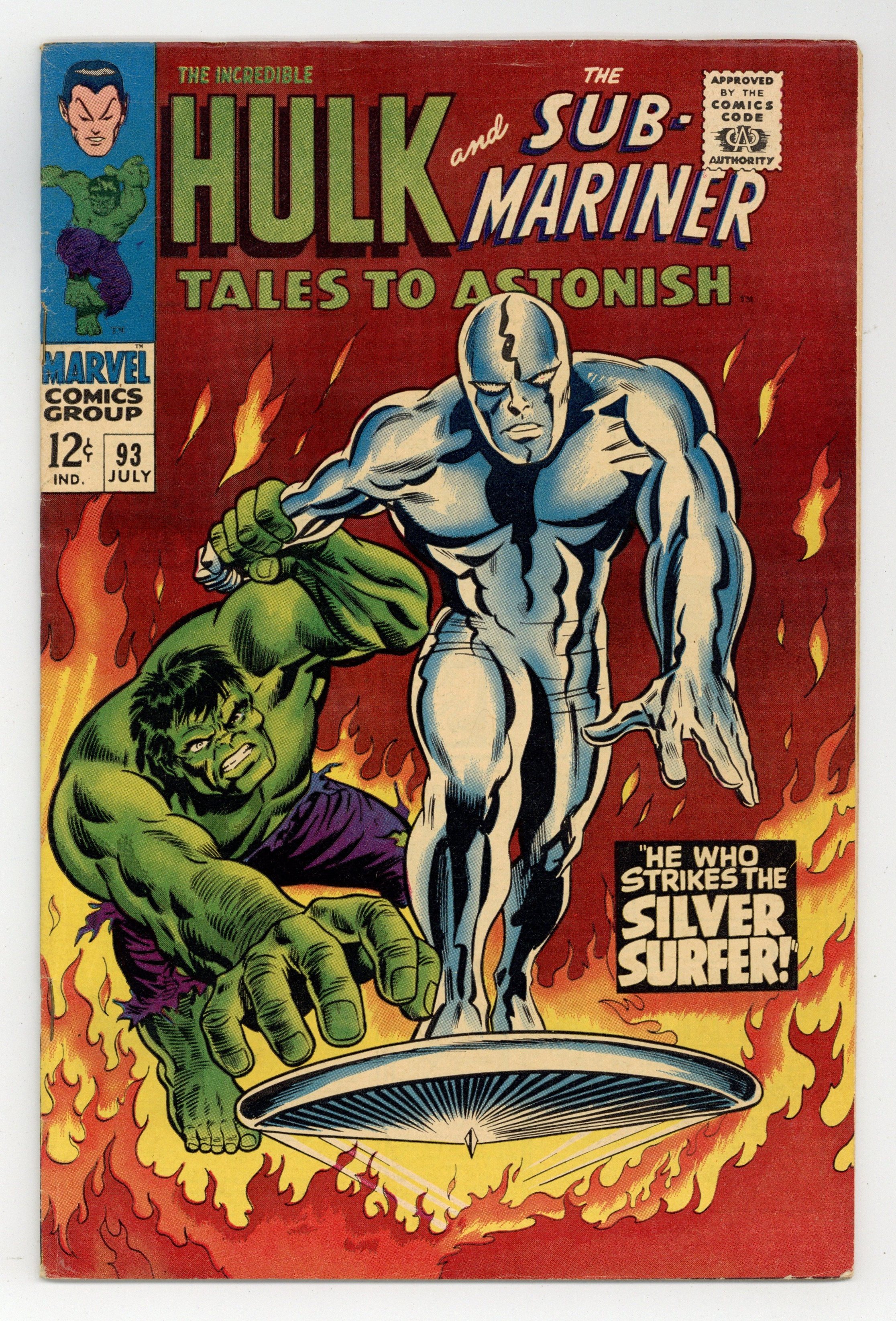 Starts Apr 20 Cover by Marie Severin and Frank Giacoia. The Monarch and the Monster, script by Roy Thomas and Dan Adkins; As Namor battles It, torpedoes from the submarine cause an avalanche, trapping It; Namor turns on the submarine and begins to punch holes in it; It (the creature) returns and they battle, further damaging the submarine and (apparently) killing it;The submarine leaves (with the carcass of It) while Namor breaks off, feeling weakness overwhelm him. He Who Strikes the Silver Surfer, script by Stan Lee, art by Marie Severin; Having 'caught' the Silver Surfer (believing him to be an alien starship), Hulk starts a fight with perhaps the only being on Earth stronger than Hulk is; The Surfer, irritated, knocks him out, then probes Hulk to discover the reason for his belligerence and discovers the damage done by the gamma radiation; Just as the Surfer prepares to reverse the damage and return Dr. Banner's life, Hulk wakes up and, seeing the action as an attack, lashes out. 36 pages, full color. Cover price $0.12. Grade: VG 4.0 explanation of grade Condition: Used (collectible)