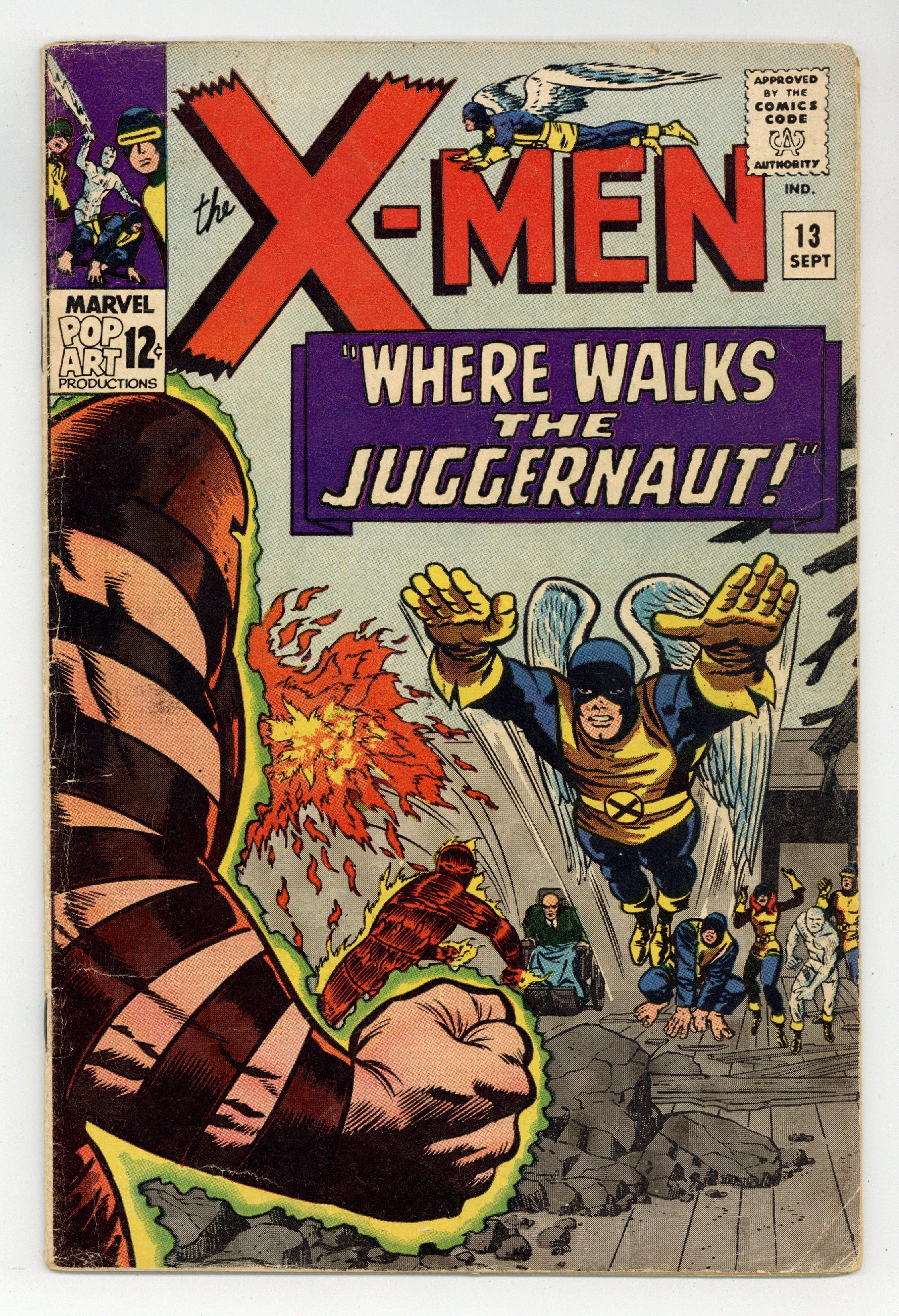 Starts Apr 20 Cover pencils by Jack Kirby, inks by Joe Sinnott. Where Walks the Juggernaut!, script by Stan Lee, pencils by Jack Kirby (layouts) and Werner Roth [as Jay Gavin], inks by Joe Sinnott; Juggernaut has invaded the mansion and the X-Men struggle to take down Xavier's unstoppable half-brother; Human Torch lends a hand and Professor X is able to bring his brother down. 36 pgs. $0.12. Cover price $0.12. Grade: GD/VG 3.0 explanation of grade Condition: Used (collectible)